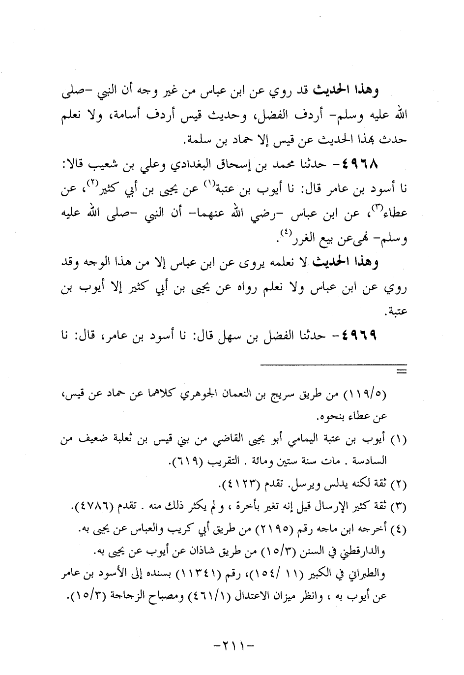 4968- حَدَّثنا مُحَمد بْنُ إِسْحَاقَ الْبَغْدَادِيُّ وَعَلِيُّ بْنُ شعيب، قَالاَ: حَدَّثنَا أسود بن عامر، قَال: حَدَّثنا أَيُّوبُ بْنُ عُتبة، عَن يَحْيَى بْنِ أَبِي كَثِيرٍ، عَن عَطاء، عَنِ ابْنِ عَبَّاسٍ، رَضِي اللَّهُ عَنْهُمَا، أَنَّ النَّبيَّ صَلَّى اللَّهُ عَلَيه وَسَلَّم نَهَى عَنْ بَيْعِ الْغَرَرِ.