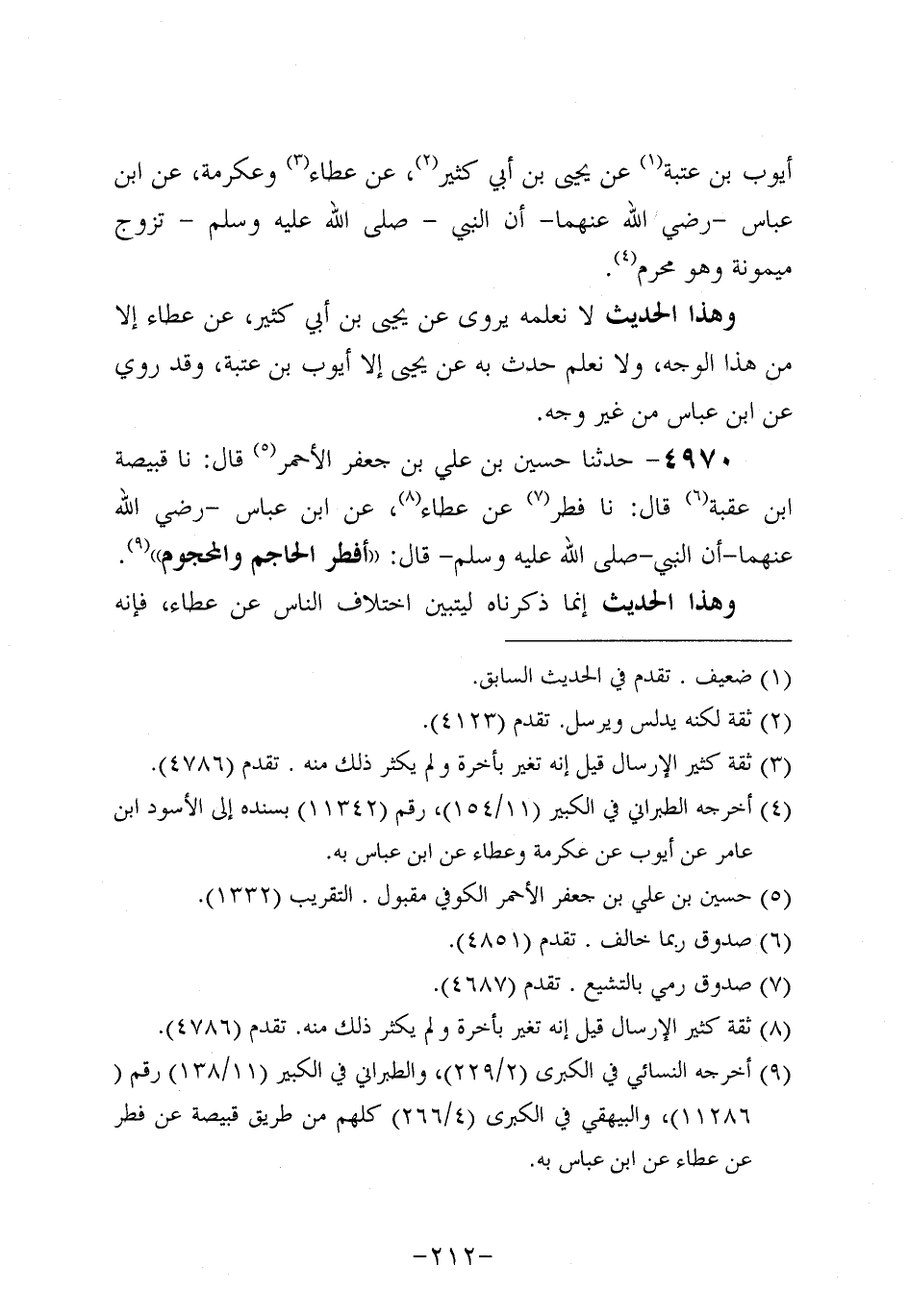 4970- حَدَّثنا حُسَيْنُ بْنُ عَلِيِّ بْنِ جَعْفَرٍ الأَحْمَرُ، قَال: حَدَّثنا قَبِيصَة بن عقبة، قَال: حَدَّثنا فِطْرٌ، عَن عَطاء، عَنِ ابْنِ عَبَّاسٍ، رَضِي اللَّهُ عَنْهُمَا، أَنَّ النَّبيَّ صَلَّى اللَّهُ عَلَيه وَسَلَّم قَالَ: أَفْطَرَ الْحَاجِمُ وَالْمَحْجُومُ.
