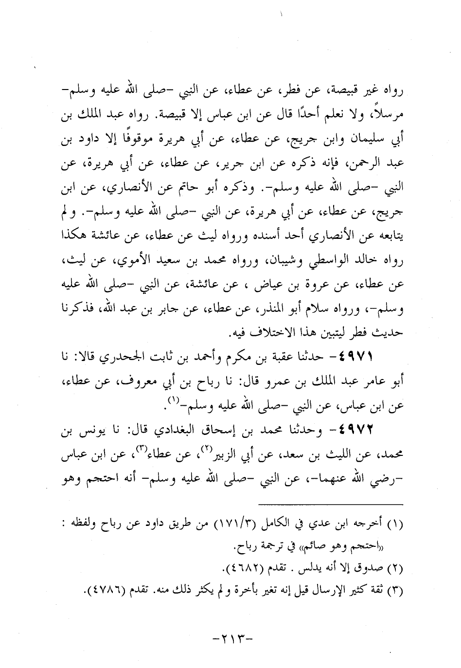 4971- حَدَّثنا عُقْبَةُ بْنُ مُكْرَمٍ، وَأحمد بْنُ ثَابِتٍ الجحدري، قَالاَ: حَدَّثنَا أَبُو عَامِرٍ عَبد الْمَلِكِ بْنُ عَمْرو، قَال: حَدَّثنا رَبَاحُ بْنُ أَبِي مَعْرُوفٍ، عَن عَطاء، عَن ابنِ عَباس، عَن النَّبِيّ صَلَّى اللَّهُ عَلَيه وَسَلَّم (ح)