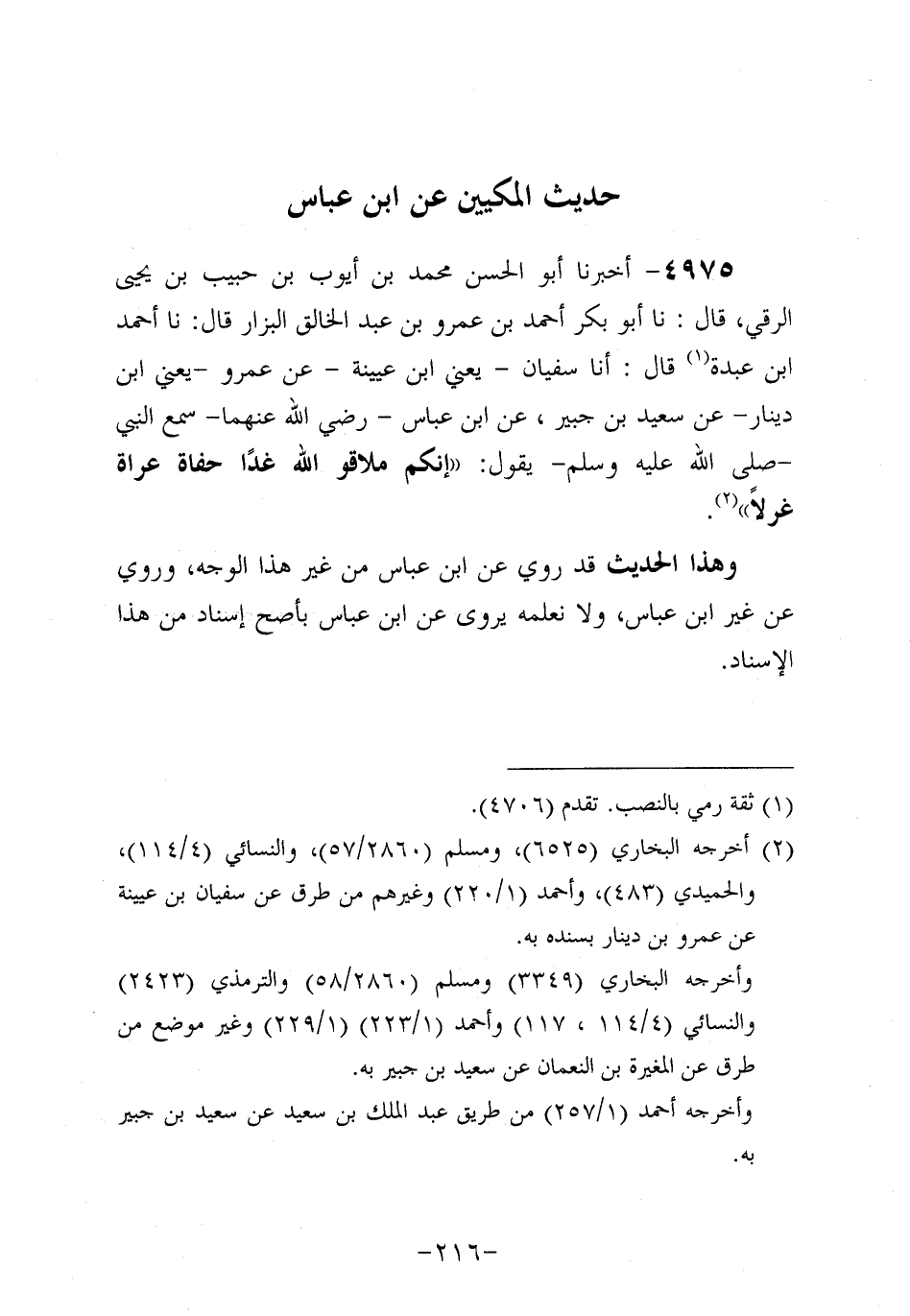 4975- أَخْبَرَنَا أَبُو الْحَسَنِ مُحَمد بْنُ أَيُّوبَ بْنِ حَبِيبِ بْنِ يَحْيَى الرقي، قَال: حَدَّثنا أَبُو بَكْرٍ أَحْمَدُ بْنُ عَمْرو بْنِ عَبد الخالق البزار، قَال: حَدَّثنا أحمد بن عَبدة، قال: أَخْبَرَنَا سُفيان، يَعْنِي ابْنَ عُيَيْنة، عَنْ عَمْرو، يَعْنِي ابْنَ دِينار، عَن سَعِيد بْنِ جُبَير، عَنِ ابْنِ عَبَّاسٍ، رَضِي الله عَنْهُمَا، سَمِعَ رَسُولَ اللَّهِ صَلَّى اللَّهُ عَلَيه وَسَلَّم يَقُولُ: إِنَّكُمْ مُلاقُو اللَّهَ غَدًا حُفَاةً عُرَاةً غُرْلا.