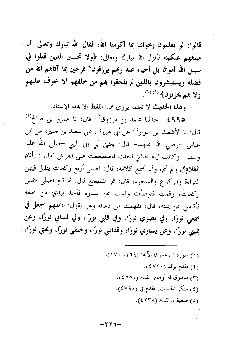 4995- حَدَّثنا مُحَمد بن مرزوق، قَال: حَدَّثنا عَمْرو بن صالح، قَال: حَدَّثنا الأَشْعَثُ بْنُ سَوَّارٍ، عَن أَبِي هُبَيْرَةَ، عَن سَعِيد بْنِ جُبَير، عَنِ ابْنِ عَبَّاسٍ، رَضِي اللَّهُ عَنْهُمَا، قَالَ: بَعَثَنِي أَبِي إِلَى النَّبِيّ صَلَّى اللَّهُ عَلَيه وَسَلَّم وَكَانَتْ لَيْلَةَ خَالَتِي فَجِئْتُ فَاضْطَجَعْتُ عَلَى الْفِرَاشِ فَقَالَ: أَنَامَ الْغُلامُ؟ وَلَمْ أَنَمْ، وَأنا أَسْمَعُ كَلامَهُ قَالَ: فَصَلَّى أَرْبَعَ رَكَعَاتٍ يُطِيلُ فِيهِنَّ الْقِرَاءَةَ وَالرُّكُوعَ وَالسُّجُودَ قَالَ: ثُمَّ اضْطَجَعَ قَالَ: ثُمَّ قَامَ فَصَلَّى خَمْسَ رَكَعَاتٍ وَقُمْتُ فَتَوَضَّأْتُ وَقُمْتُ عَنْ يَسَارِهِ فَأَخَذ بِيَدِي مِنْ خَلْفِهِ فَأَقَامَنِي عَنْ يَمِينِهِ قَالَ: فَفَهِمْتُ مِنْ دُعَائِهِ، وهُو يَقُولُ: اللَّهُمَّ اجْعَلْ فِي سَمْعِي نُورًا وَفِي بَصَرِي نُورًا وَفِي قَلْبِي نُورًا وَفِي لِسَانِي نُورًا، وعَن يَمِينِي نُورًا، وعَن يَسَارِي نُورًا وَقُدَّامِي نُورًا وَخَلْفِي نُورًا وَتَحْتِي نُورًا وَفَوْقِي نُورًا اللَّهُمَّ أَعْظِمْ لِي نُورًا.