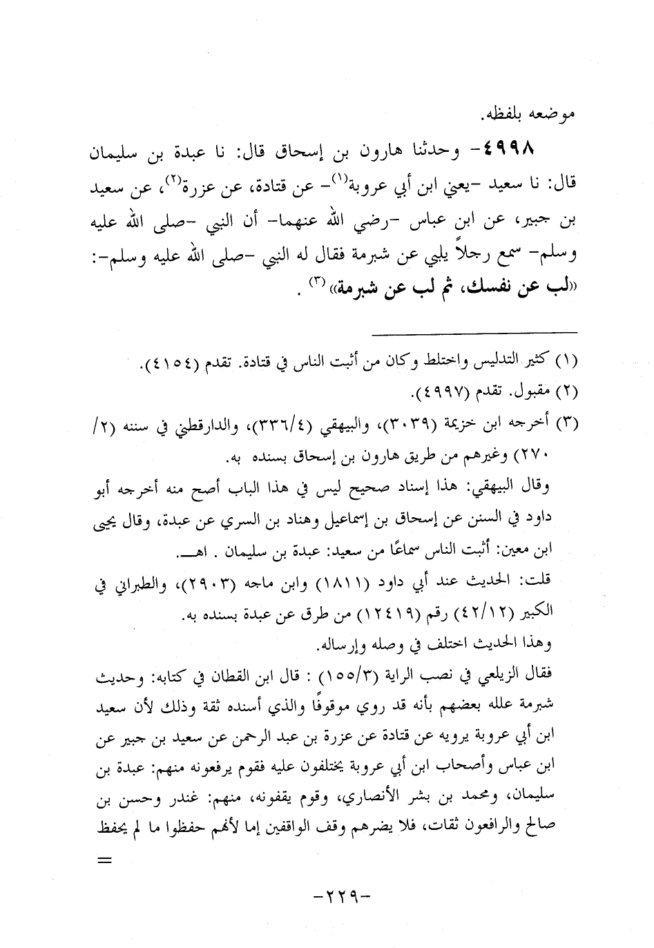4998- وحَدَّثنا هارون بن إسحاق، قَال: حَدَّثنا عَبدة بن سليمان، قَال: حَدَّثنا سَعِيد، يَعْنِي ابْنَ أَبِي عَرُوبة عَنْ قَتَادَةَ، عَن عَزْرَةَ، عَن سَعِيد بْنِ جُبَير، عَنِ ابْنِ عَبَّاسٍ، رَضِي اللَّهُ عَنْهُمَا، أَنَّ النَّبيَّ صَلَّى اللَّهُ عَلَيه وَسَلَّم سَمِعَ رَجُلا يُلَبِّي عَنْ شُبْرُمَةَ فَقَالَ لَهُ النَّبِيّ صَلَّى اللَّهُ عَلَيه وَسَلَّم لَبِّ عَنْ نَفْسِكَ، ثُمَّ لَبِّ عَنْ شُبْرُمَةَ.