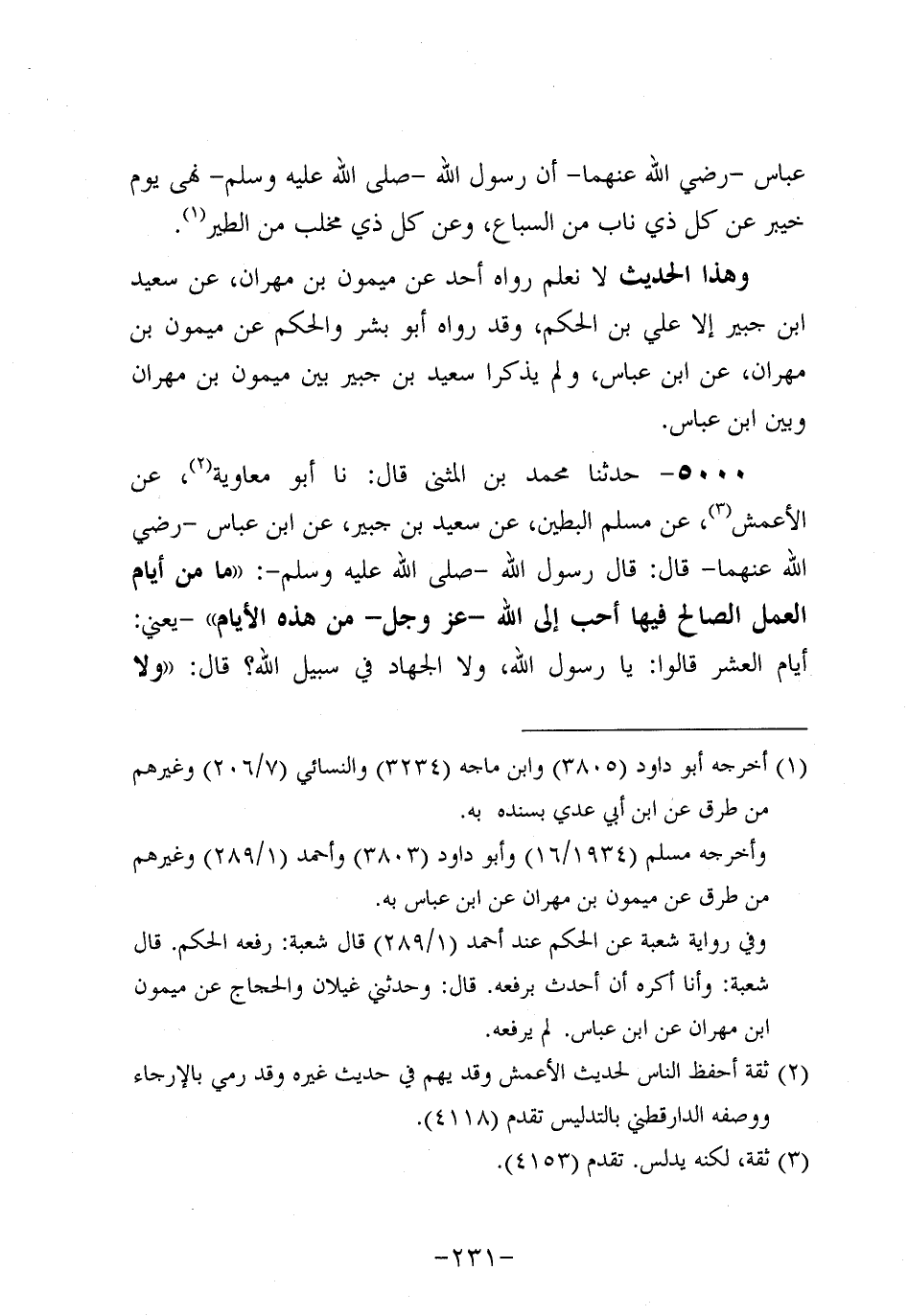 5000- حَدَّثنا مُحَمَّدُ بْنَ الْمُثَنَّى، قَال: حَدَّثنا أَبُو مُعَاوِيَةَ عَنِ الأَعمَش، عَن مُسْلم البَطِين، عَن سَعِيد بْنِ جُبَير، عَنِ ابْنِ عَبَّاسٍ، رَضِي اللَّهُ عَنْهُمَا، قَالَ: قَالَ رَسُول اللهِ صَلَّى اللَّهُ عَلَيه وَسَلَّم: مَا مِنْ أَيَّامٍ الْعَمَلُ الصَّالِحُ فِيهَا أَحَبُّ إِلَى اللَّهِ عَزَّ وَجَلَّ مِنْ هَذِهِ الأَيَّامِ، يَعْنِي أَيَّامَ الْعَشْرِ قَالُوا: يَا رَسولَ اللهِ، ولاَ الْجِهَادُ فِي سَبِيلِ اللَّهِ؟ قَالَ: ولاَ الْجِهَادُ فِي سَبِيلِ اللَّهِ إلاَّ رَجَلٌ خَرَجَ بِنَفْسِهِ وَمَالِهِ فَلَمْ يَرْجِعْ بِشَيْءٍ.