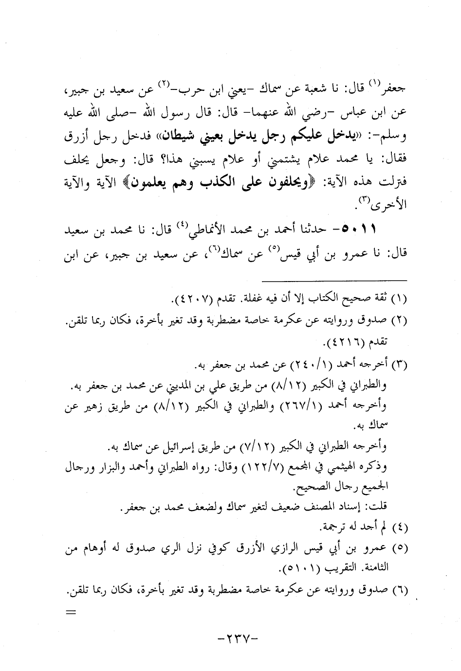 5011- حَدَّثنا أحمد بن مُحَمد الأنماطي، قَال: حَدَّثنا مُحَمد بن سَعِيد، قَال: حَدَّثنا عَمْرو بْنُ أَبِي قَيْسٍ، عَن سِمَاك، عَن سَعِيد بْنِ جُبَير، عَنِ ابْنِ عَبَّاسٍ، رَضِي اللَّهُ عَنْهُمَا، أَنَّ النَّبيَّ صَلَّى اللَّهُ عَلَيه وَسَلَّم قَنَتَ ثَلاثِينَ صَبَاحًا فِي صَلاةِ الضُّحَى.