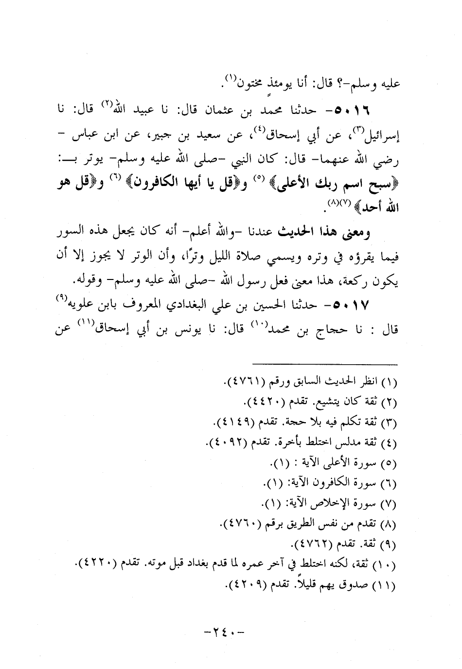 5016- حَدَّثنا مُحَمد بن عُثمَان، قَال: حَدَّثنا عُبَيد الله، قَال: حَدَّثنا إِسْرَائِيلُ، عَن أَبِي إِسحاق، عَن سَعِيد بْنِ جُبَير، عَنِ ابْنِ عَبَّاسٍ، رَضِي اللَّهُ عَنْهُمَا، قَالَ: كَانَ النَّبِيّ صَلَّى اللَّهُ عَلَيه وَسَلَّم يوتر بـ: {سَبِّحِ اسْمَ رَبِّكَ الأَعْلَى} ، و {قُلْ يَا أَيُّهَا الْكَافِرُونَ} ، و {قُلْ هُوَ اللَّهُ أَحَدٌ} .