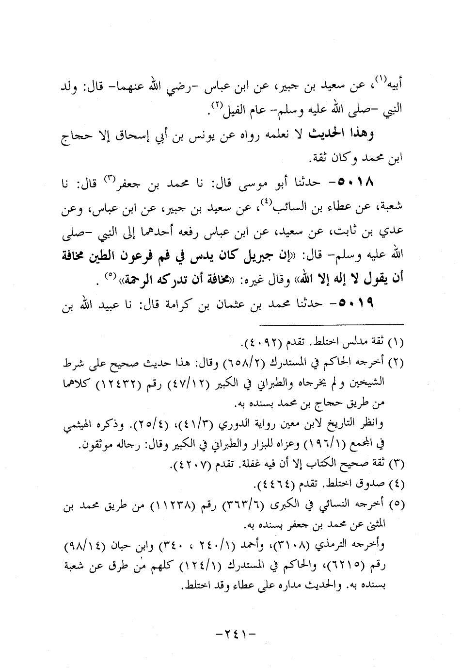 5018- حَدَّثنا أَبُو موسى، قَال: حَدَّثنا مُحَمَّدُ بْنَ جَعْفَرٍ، قَال: حَدَّثنا شُعْبَةُ، عَن عَطَاءِ بْنِ السَّائِبِ، عَن سَعِيد بْنِ جُبَير، عَنِ ابْنِ عَبَّاسٍ، وعَن عَدِيّ بْنِ ثَابِتٍ، عَن سَعِيد، عَنِ ابْنِ عَبَّاسٍ رَفَعَهُ أَحَدُهُمَا إِلَى النَّبِيّ صَلَّى اللَّهُ عَلَيه وَسَلَّم قَالَ: إِنَّ جِبْرِيلَ كَانَ يَدُسُّ فِي فَمِ فِرْعَوْنَ الطِّينَ مَخَافَةَ أَنْ يَقُولَ لا إِلَهَ إلاَّ اللَّهُ، وَقال غَيْرُهُ: مَخَافَةَ أَنْ تدركه الرحمة.