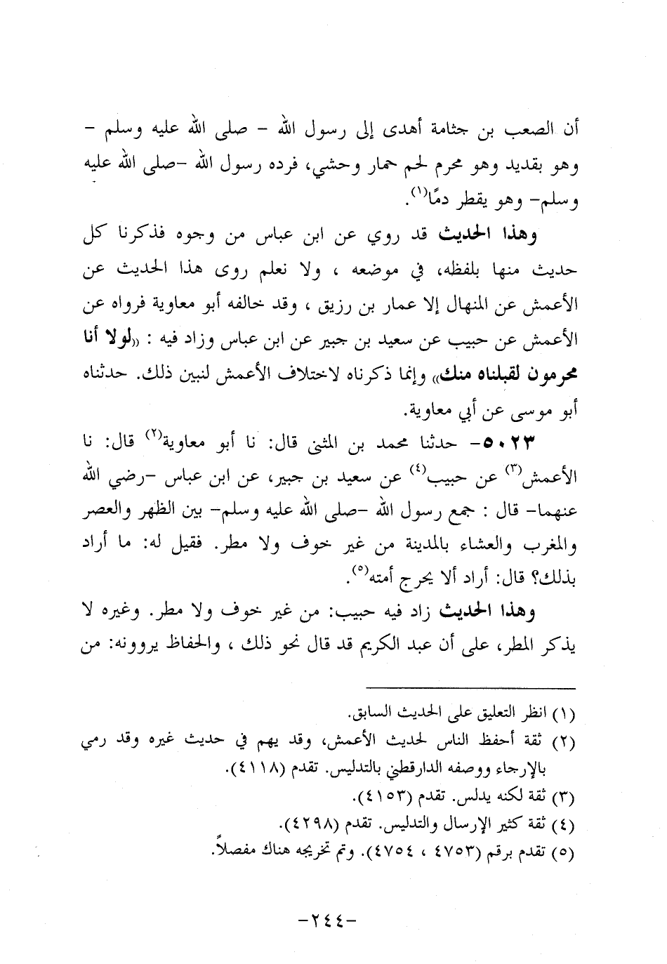5023- حَدَّثنا مُحَمَّدُ بْنَ الْمُثَنَّى، قَال: حَدَّثنا أَبُو معاوية، قَال: حَدَّثنا الأَعمَش، عَن حَبِيبٍ، عَن سَعِيد بْنِ جُبَير، عَنِ ابْنِ عَبَّاسٍ، رَضِي اللَّهُ عَنْهُمَا، قَالَ: جَمَعَ رَسُولُ اللَّهِ صَلَّى اللَّهُ عَلَيه وَسَلَّم بَيْنَ الظُّهْرِ وَالْعَصْرِ وَالْمَغْرِبِ وَالْعِشَاءِ بِالْمَدِينَةِ مِنْ غَيْرِ خَوْفٍ، ولاَ مَطَرٍ فَقِيلَ لَهُ: مَا أَرَادَ بِذَلِكَ؟ قَالَ: أَرَادَ أَلا يُحْرِجَ أُمَّتَهُ.