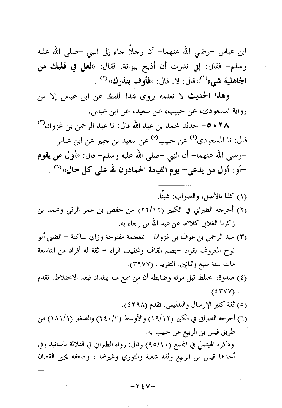 5028- حَدَّثنا مُحَمد بن عَبد الله، قَال: حَدَّثنا عَبد الرحمن بن غزوان، قَال: حَدَّثنا الْمَسْعُودِيُّ عَن حَبيب، عَن سَعِيد بْنِ جُبَير، عَنِ ابْنِ عَبَّاسٍ، رَضِي اللَّهُ عَنْهُمَا، أَنَّ النَّبيَّ صَلَّى اللَّهُ عَلَيه وَسَلَّم قَالَ: أَوَّلُ مَنْ يَقُومُ، أَوْ: أَوَّلُ مَنْ يُدْعَى يَوْمَ الْقِيَامَةِ الْحَمَّادُونَ لِلَّهِ عَلَى كُلِّ حَالٍ.