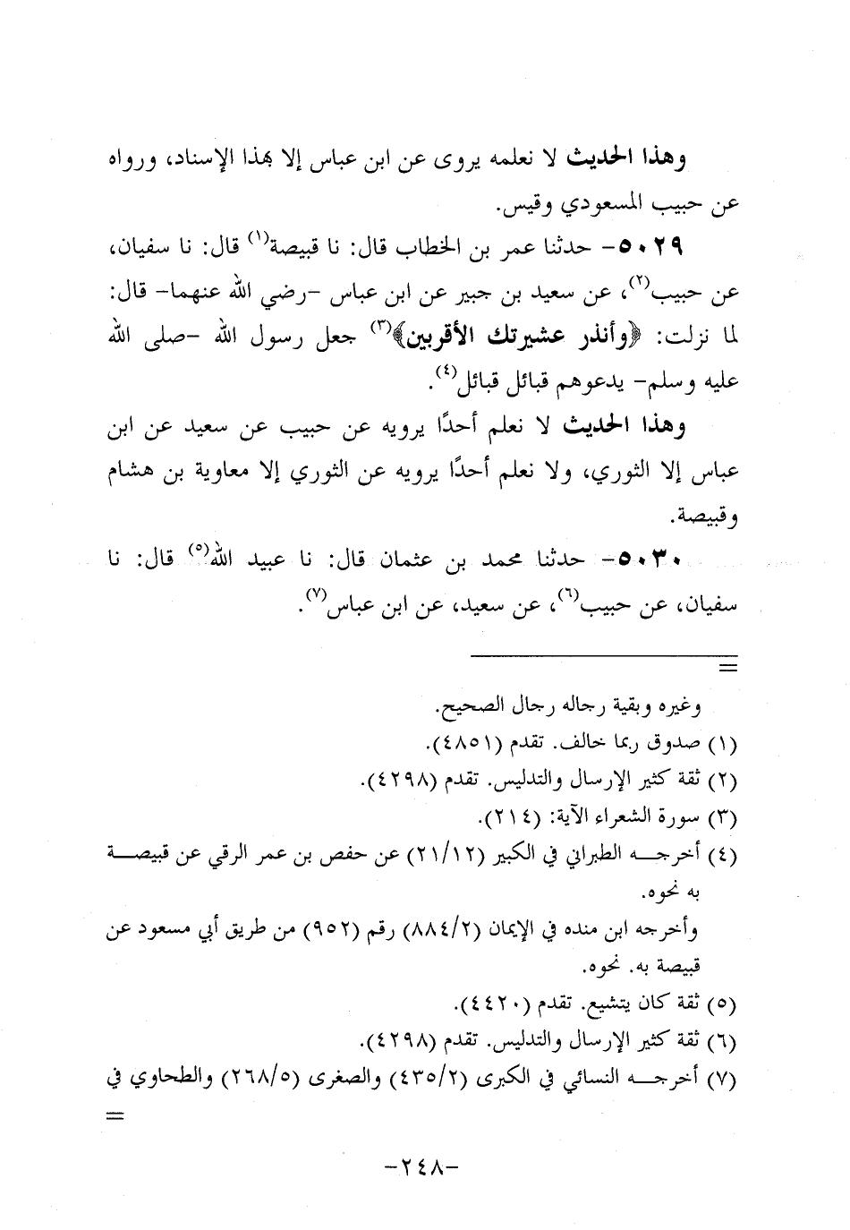 5029- حَدَّثنا عُمَر بن الخطاب، قَال: حَدَّثنا قَبِيصَة، قَال: حَدَّثنا سُفيان، عَن حَبِيبٍ، عَن سَعِيد بْنِ جُبَير، عَنِ ابْنِ عَبَّاسٍ، رَضِي اللَّهُ عَنْهُمَا، قَالَ: لما نزلت: {وأنذر عشيرتك الأقربين} جَعَلَ رَسُولُ اللَّهِ صَلَّى اللَّهُ عَلَيه وَسَلَّم، يَدْعُوهُمْ قَبَائِلَ قَبَائِلَ.