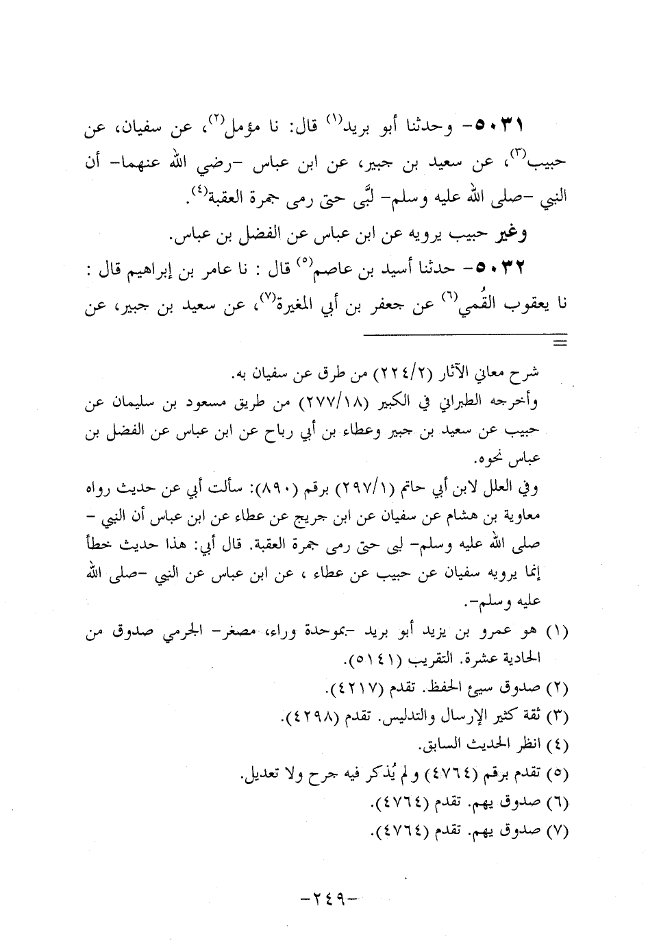 5031- وحَدَّثنا أَبُو بريد قال: مُؤَمَّل عَنْ سُفيان، عَن حَبِيبٍ، عَن سَعِيد بْنِ جُبَير، عَنِ ابْنِ عَبَّاسٍ، رَضِي اللَّهُ عَنْهُمَا، أَنَّ النَّبيَّ صَلَّى اللَّهُ عَلَيه وَسَلَّم لَبَّى حَتَّى رَمَى جَمْرَةَ الْعَقَبَةِ.