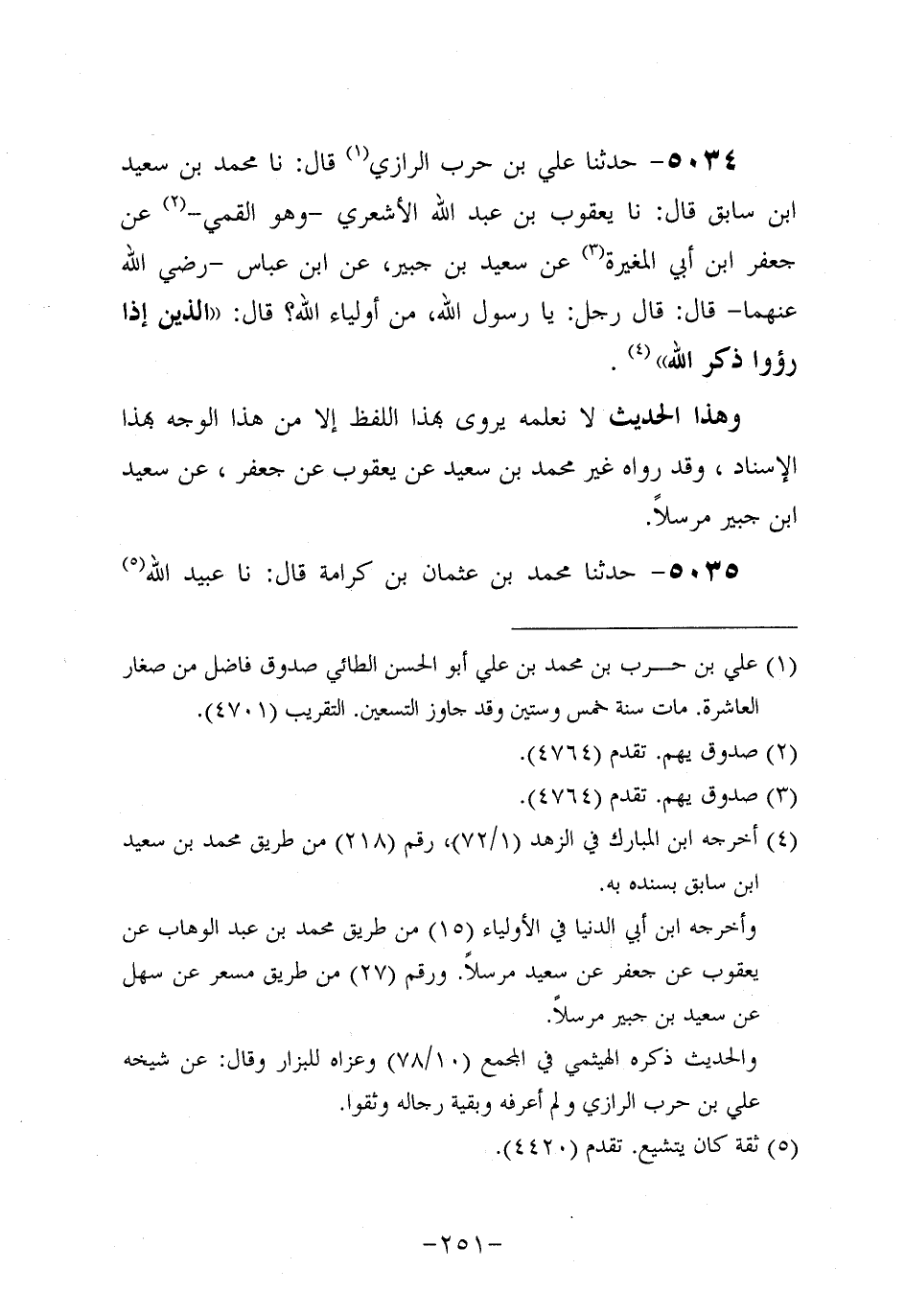 5034- حَدَّثنا على بن حرب الرازي، قَال: حَدَّثنا مُحَمد بن سَعِيد بن سابق، قَال: حَدَّثنا يَعْقُوبُ بْنُ عَبد اللَّهِ الأَشْعَرِيُّ، وهُو الْقُمِّيُّ عَنْ جَعْفَرِ بْنِ أَبِي الْمُغِيرَةِ، عَن سَعِيد بْنِ جُبَير، عَنِ ابْنِ عَبَّاسٍ، رَضِي اللَّهُ عَنْهُمَا، قَالَ: قَالَ رَجُلٌ: يَا رسولَ اللهِ، من أولياء الله؟ قال: الذين إذا رؤوا ذِكْرَ اللَّهِ.
