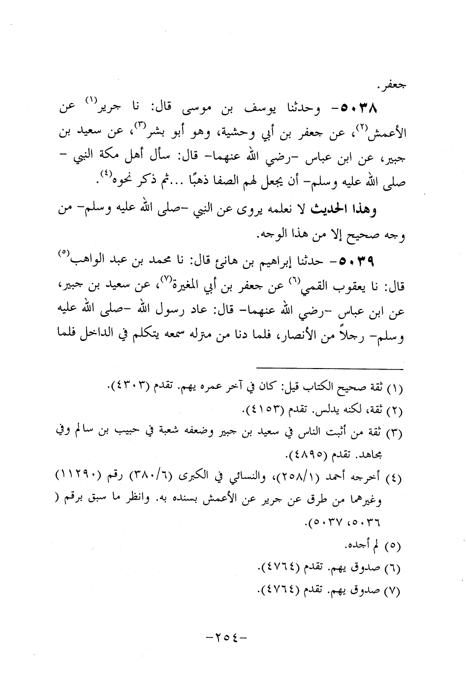 5038- وحَدَّثنا يوسف بن موسى، قَال: حَدَّثنا جَرِير، عَن الأَعمَش، عَن جَعْفَرِ بْنِ أَبِي وَحْشِيَّةَ، وهُو أَبُو بِشْرٍ، عَن سَعِيد بْنِ جُبَير، عَنِ ابْنِ عَبَّاسٍ، رَضِي اللَّهُ عَنْهُمَا، قَالَ: سَأَلَ أَهْلُ مَكَّةَ النَّبِيّ صَلَّى اللَّهُ عَلَيه وَسَلَّم أَنْ يَجْعَلَ لَهُمُ الصَّفَا ذَهَبًا.، ثُمَّ ذَكَرَ نَحْوَهُ.