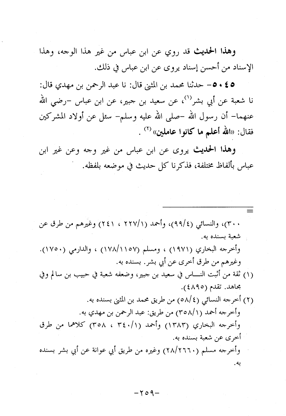 5045- حَدَّثنا مُحَمَّدُ بْنَ الْمُثَنَّى، قَال: حَدَّثنا عَبد الرحمن بن مهدي، قَال: حَدَّثنا شُعْبَةُ، عَن أَبِي بِشْرٍ، عَن سَعِيد بْنِ جُبَير، عَنِ ابْنِ عَبَّاسٍ، رَضِي اللَّهُ عَنْهُمَا، أَنَّ رَسُولَ اللهِ صَلَّى اللَّهُ عَلَيه وَسَلَّم سُئِلَ عَن أَوْلادِ الْمُشْرِكِينَ فَقَالَ: اللَّهُ أَعْلَمُ مَا كَانُوا عَامِلِينَ.