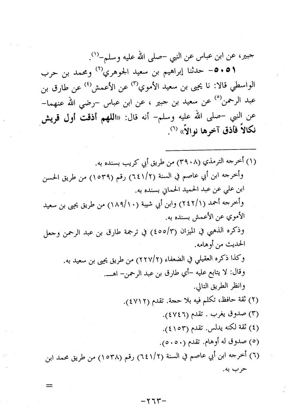 5051- حَدَّثنا إِبْرَاهِيمُ بْنُ سَعِيد الْجَوْهَرِيُّ، ومُحَمَّد بْنُ حرب الواسطي، قَالاَ: حَدَّثنَا يَحْيَى بْنُ سَعِيد الأُمَوي عَنِ الأَعمَش، عَن طَارِقِ بْنِ عَبد الرَّحْمَنِ، عَن سَعِيد بْنِ جُبَير، عَنِ ابْنِ عَبَّاسٍ، رَضِي اللَّهُ عَنْهُمَا، عَنِ النَّبِيّ صَلَّى اللَّهُ عَلَيه وَسَلَّم؛ أَنَّه قَالَ: اللَّهُمَّ أَذَقْتَ أَوَّلَ قُرَيْشٍ نَكَالا فَأَذِقْ آخِرَهَا نَوَالا.
