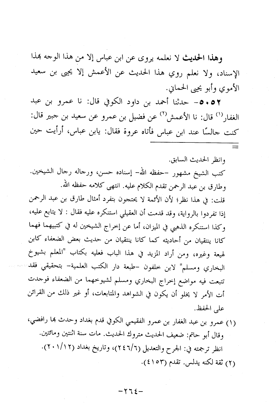 5052- حَدَّثنا أحمد بن داود الكوفي، قَال: حَدَّثنا عَمْرو بن عَبد الغفار، قَال: حَدَّثنا الأَعمَش، عَن فُضَيْلِ بْنِ عَمْرو، عَن سَعِيد بْنِ جُبَير قَالَ: كُنْتُ جَالِسًا عِنْدَ ابْنِ عَبَّاسٍ فَأَتَاهُ عُرْوَةُ فَقَالَ: يَا ابْنَ عَبَّاسٍ أَرَأَيْتَ حِينَ تُفْتِي بِالْمُتْعَةِ وَقَدْ عَرَفْتَ أَنَّ أَبَا بَكْرٍ وَعُمَرَ كَانَا يَنْهَيَانِ عَنْهَا وَيَكْرَهَانِهَا فَقَالَ ابْنُ عَبَّاسٍ: إِنَّهُ كَانَ آخِرَ عَهْدِ رَسُولِ اللَّهِ صَلَّى اللَّهُ عَلَيه وَسَلَّم الَّذِي فارق الناس عليه فقال عروة: والله ياابن عَبَّاسٍ لأَبُو بَكْرٍ وَعُمَرُ كَانَا أَعْلَمَ بِسُنَّةِ رَسُولِ اللَّهِ صَلَّى اللَّهُ عَلَيه وَسَلَّم مِنْكَ. فقال ابن عباس: ياعرية ما أرى العذاب إلاَّ سينزل عليك.أُخْبِرُكَ أَنَّهُ كَانَ آخِرَ عَهْدِ رَسُولِ اللَّهِ صَلَّى اللَّهُ عَلَيه وَسَلَّم الَّذِي فَارَقَ النَّاسَ عَلَيْهِ وَتَقُولُ كَانَ أَبُو بَكْرٍ وَعُمَرُ.