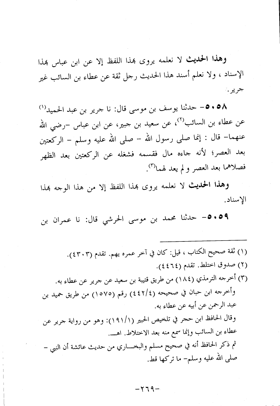 5058- حَدَّثنا يوسف بن موسى، قَال: حَدَّثنا جَرِيرُ بْنُ عَبد الْحَمِيدِ، عَن عَطاء بْنِ السَّائِبِ، عَن سَعِيد بْنِ جُبَير، عَنِ ابْنِ عَبَّاسٍ، رَضِي اللَّهُ عَنْهُمَا، قَالَ: إِنَّمَا صَلَّى رَسُولُ اللَّهِ صَلَّى اللَّهُ عَلَيه وَسَلَّم الرَّكْعَتَيْنِ بَعْدَ الْعَصْرِ لأَنَّهُ جَاءَهُ مَالٌ فَقَسَّمَهُ فَشَغَلَهُ عَنِ الرَّكْعَتَيْنِ بَعْدَ الظُّهْرِ فَصَلاهُمَا بَعْدَ الْعَصْرِ وَلَمْ يَعُدْ لَهُمَا.