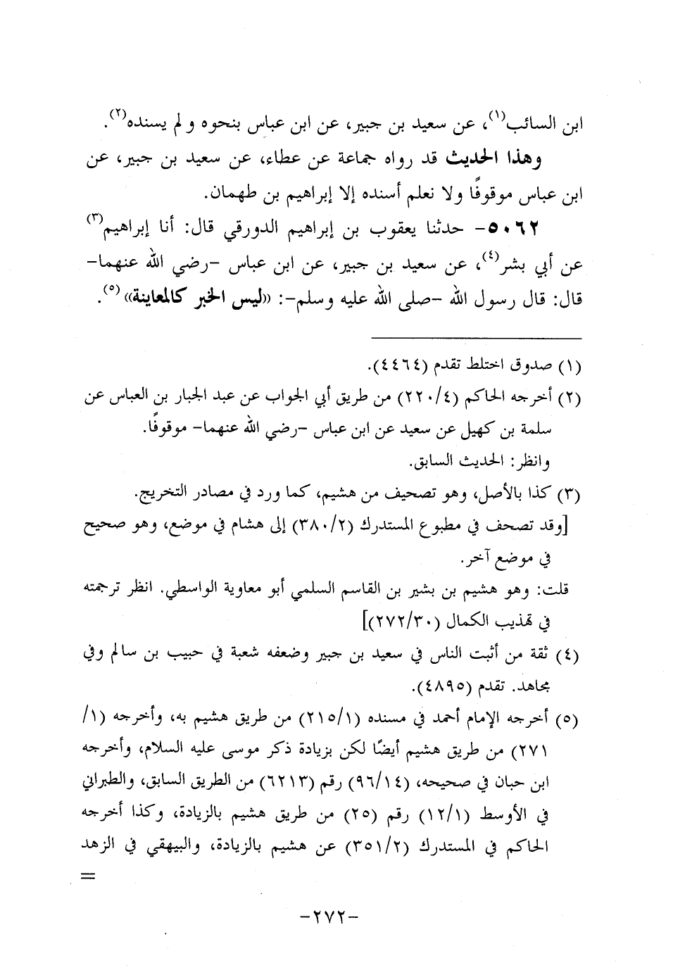 5062- حَدَّثنا يعقوب بن إبراهيم الدورقي، قال: أَخْبَرَنَا إِبْرَاهِيمُ، عَن أَبِي بِشْرٍ، عَن سَعِيد بْنِ جُبَير، عَنِ ابْنِ عَبَّاسٍ، رَضِي اللَّهُ عَنْهُمَا، قَالَ: قَالَ رَسُول اللهِ صَلَّى اللَّهُ عَلَيه وَسَلَّم: لَيْسَ الْخَبَرُ كَالْمُعَايَنَةِ.