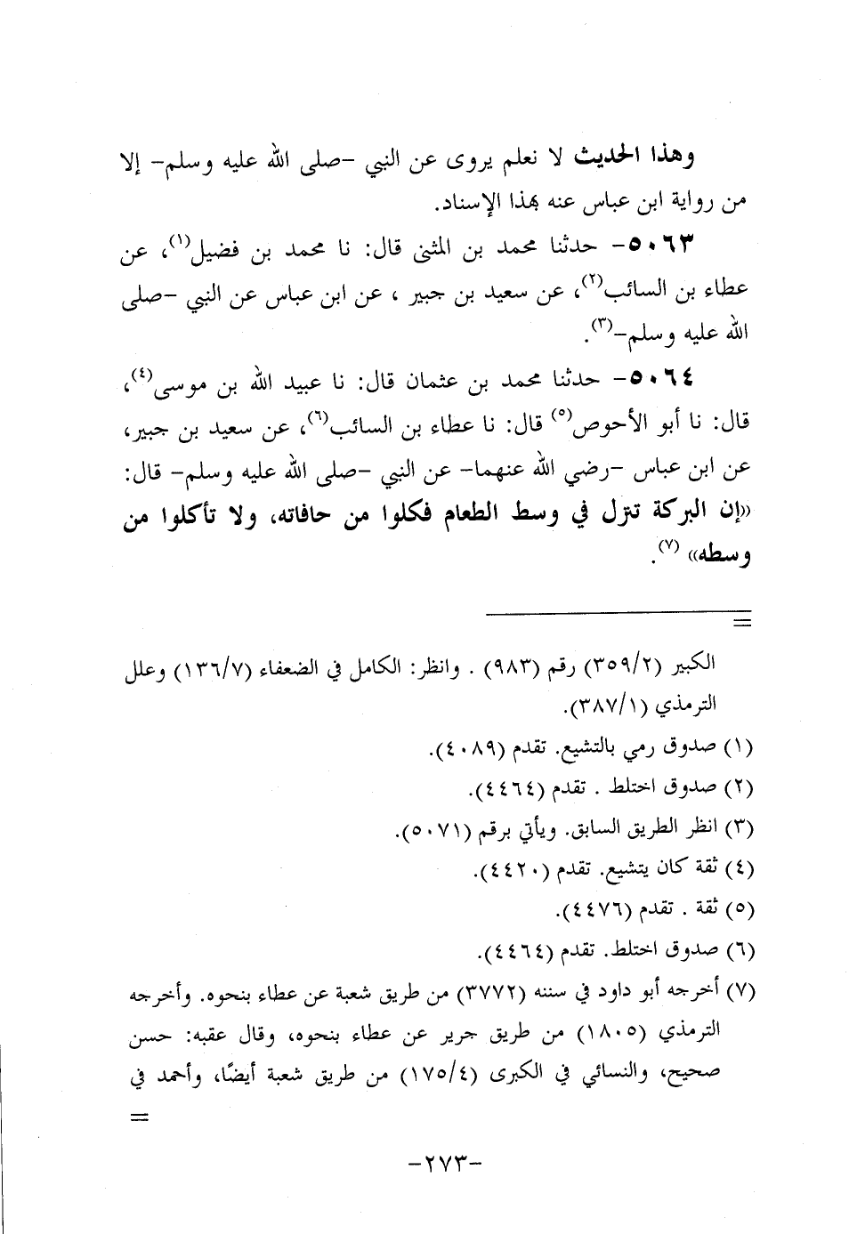 5064- حَدَّثنا مُحَمَّدُ بْنَ عُثمَان , قال حَدَّثنا عبيد الله بن موسى , قال: حَدَّثنا أَبُو الأحوص، قال: حَدَّثنا عَطاء بْنِ السَّائِبِ، عَن سَعِيد بْنِ جُبَير، عَن ابنِ عَباس رَضِيَ اللَّهُ عَنْهُمَا، عَن النَّبِيّ صَلَّى اللَّهُ عَلَيه وَسَلَّم قَالَ: إِنَّ البركة تنزل من وَسَطِ الطَّعَامِ فَكُلُوا مِنْ حَافَّاتِهِ، ولاَ تَأْكُلُوا مِنْ وَسَطِهِ.