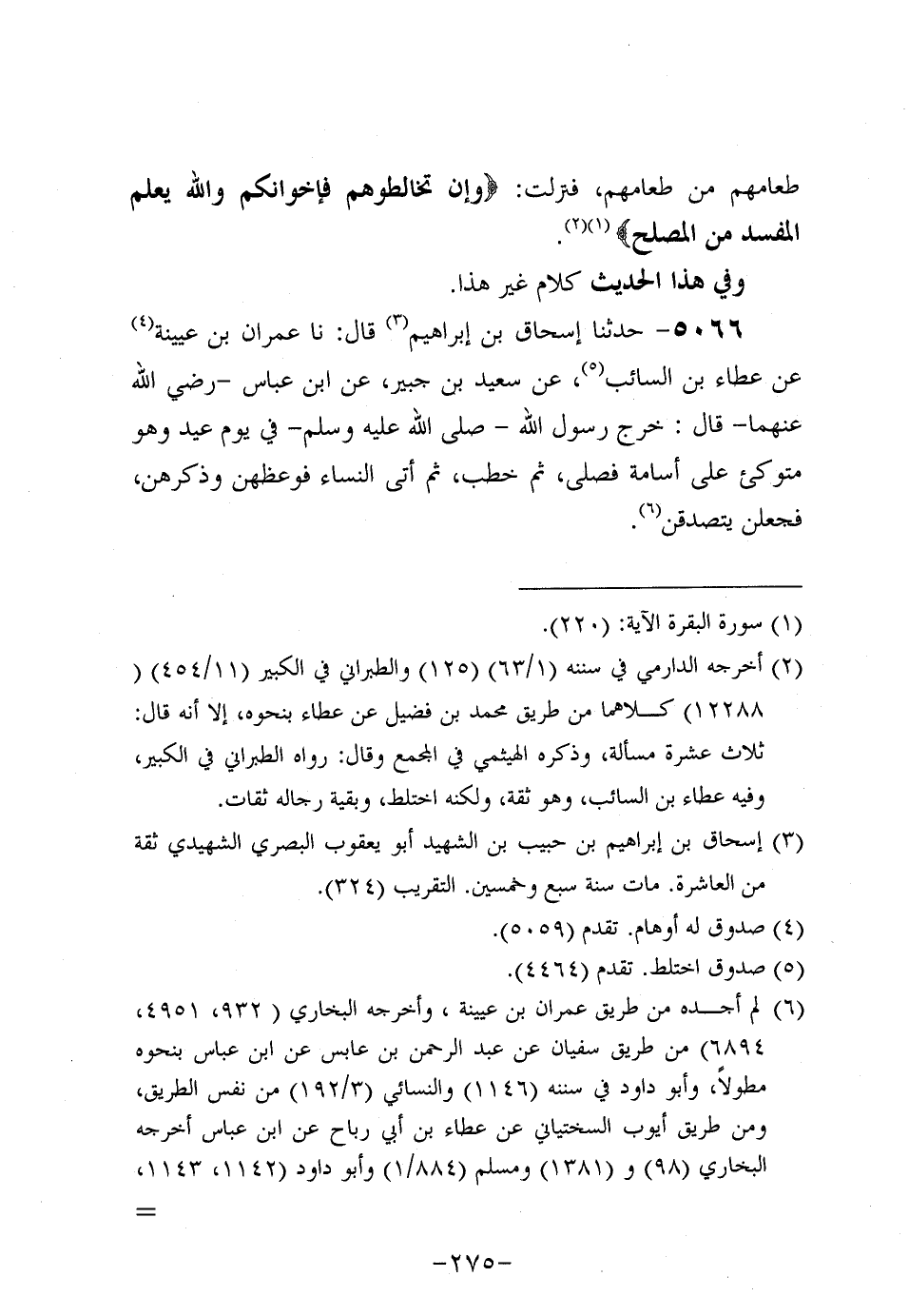 5066- حَدَّثنا إسحاق بن إبراهيم، قَال: حَدَّثنا عِمْرَانُ بْنُ عُيَيْنة، عَن عَطاء بْنِ السَّائِبِ، عَن سَعِيد بْنِ جُبَير، عَنِ ابْنِ عَبَّاسٍ، رَضِي اللَّهُ عَنْهُمَا، قَالَ: خَرَجَ رَسُولُ اللَّهِ صَلَّى اللَّهُ عَلَيه وَسَلَّم فِي يَوْمِ عِيدٍ، وهُو متوكيء عَلَى أُسَامة، فَصَلَّى، ثُمَّ خَطَبَ، ثُمَّ أَتى النِّسَاءَ فَوُعَظَهُنَّ وَذَكَّرَهُنَّ، فَجَعَلْنَ يَتَصَدَّقْنَ.