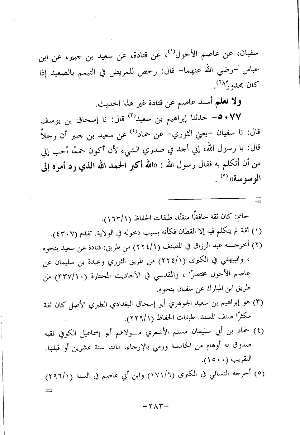 5077- حَدَّثنا إبراهيم بن سَعِيد، قَال: حَدَّثنا إسحاق بن يوسف، قَال: حَدَّثنا سُفيان، يَعْنِي الثَّورِيّ، عَن حَمَّادٍ، عَن سَعِيد بْنِ جُبَير أَنَّ رَجُلا قَالَ: يَا رَسولَ اللهِ إِنِّي أَجِدُ فِي صَدْرِي الشَّيْءَ لأَنْ أَكُونَ حَمَمًا أَحَب إلَيَّ مِنْ أَنْ أَتَكَلَّمَ بِهِ؟ فَقَالَ رَسُولُ اللَّهِ: اللَّهُ أَكْبَرُ الْحَمْدُ لِلَّهِ الَّذِي رَدَّ أَمْرَهُ إِلَى الْوَسْوَسَةِ.