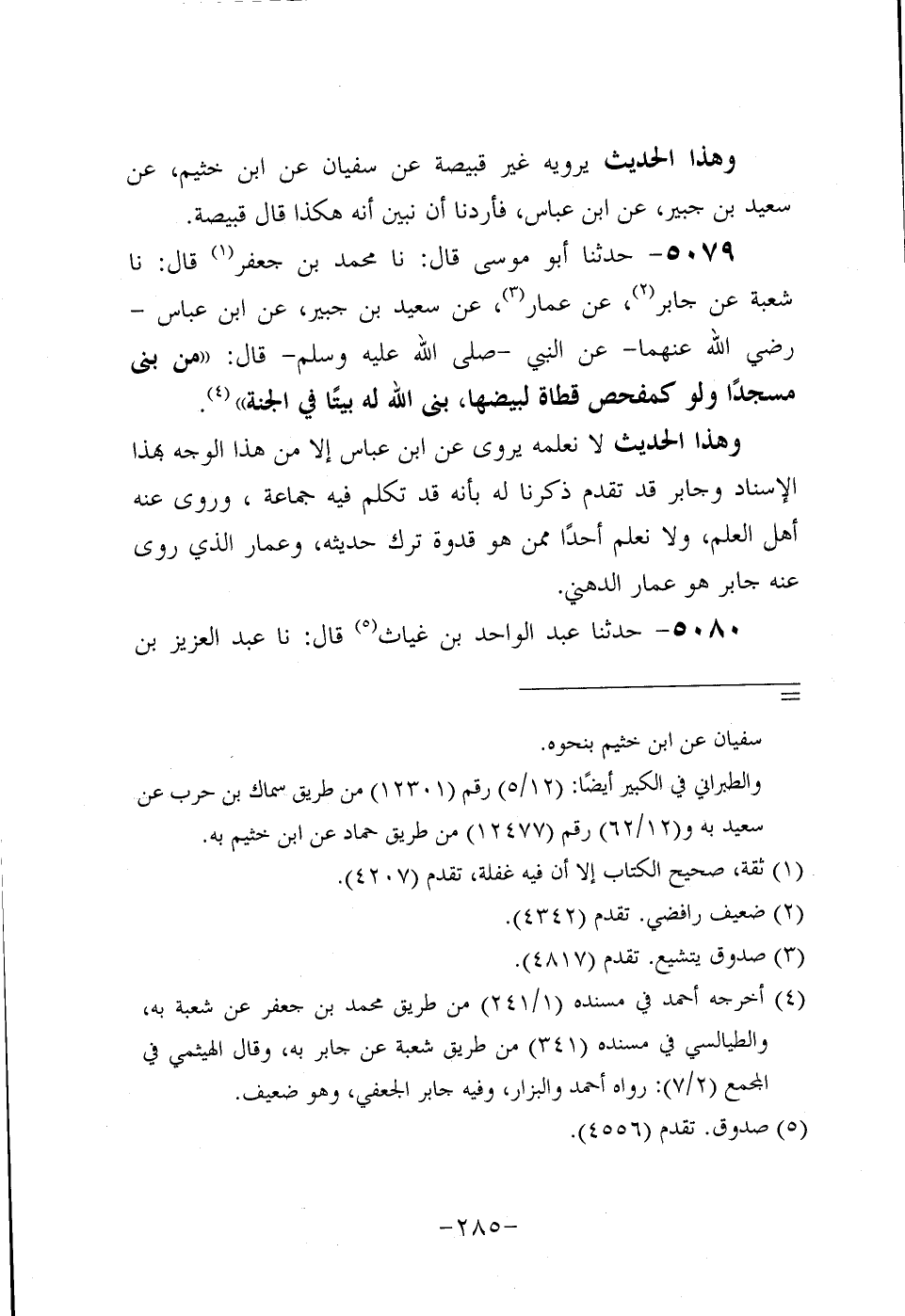 5079- حَدَّثنا أَبُو موسى، قَال: حَدَّثنا مُحَمَّدُ بْنَ جَعْفَرٍ، قَال: حَدَّثنا شُعْبَةُ، عَن جَابِرٍ، عَنْ عَمَّار، عَن سَعِيد بْنِ جُبَير، عَنِ ابْنِ عَبَّاسٍ، رَضِي اللَّهُ عَنْهُمَا، عَنِ النَّبِيّ صَلَّى اللَّهُ عَلَيه وَسَلَّم قَالَ: مَنْ بَنَى مَسْجِدًا، وَلَوْ كَمَفْحَصِ قَطَاةٍ لِبَيْضِهَا، بَنَى اللَّهُ لَهُ بَيْتًا فِي الْجَنَّةِ.