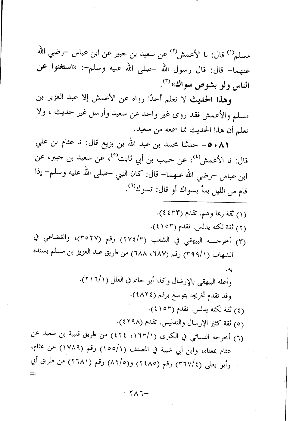 5081- حَدَّثنا مُحَمد بْنُ عَبد اللَّهِ بْنِ بَزِيغٍ، قَال: حَدَّثنا عثام بن علي، قَال: حَدَّثنا الأَعمَش، عَن حَبِيبِ بْنِ أَبِي ثَابِتٍ، عَن سَعِيد بْنِ جُبَير، عَنِ ابْنِ عَبَّاسٍ، رَضِي الله عَنْهُمَا، قال: كان رسول اللَّهُ عَلَيْهِ وَسَلَّمَ إِذَا قَامَ مِنَ اللَّيْلِ بَدَأَ بِسِوَاكٍ، أَوْ قَالَ: تَسَوَّكَ.