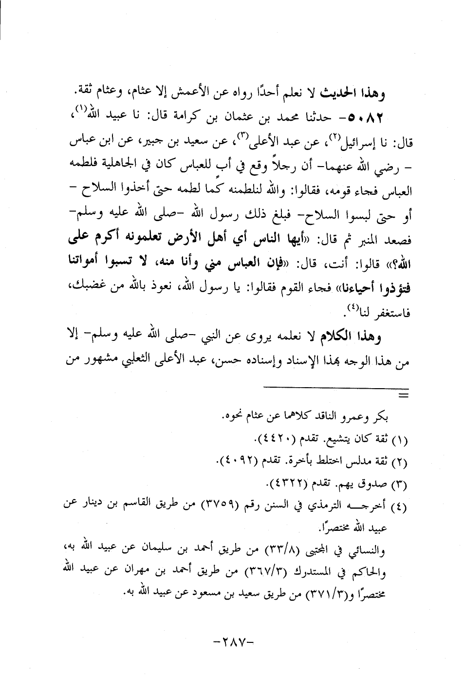 5082- حَدَّثنا مُحَمد بْنُ عُثمَان بْنِ كَرَامَةَ، قَال: حَدَّثنا عُبَيد الله، قَال: حَدَّثنا إِسْرَائِيلُ، عَن عَبد الأَعْلَى، عَن سَعِيد بْنِ جُبَير، عَنِ ابْنِ عَبَّاسٍ، رَضِي اللَّهُ عَنْهُمَا، أَنَّ رَجُلا وَقَعَ فِي أَبٍ لِلْعَبَّاسِ كَانَ فِي الْجَاهِلِيَّةِ فَلَطَمَهُ الْعَبَّاسُ فَجَاءَ قَوْمُهُ فَقَالُوا: وَاللَّهِ لَنَلْطِمَنَّهُ كَمَا لَطَمَهُ حَتَّى أَخَذُوا السِّلاحَ، أَوْ حَتَّى لَبِسُوا السِّلاحَ فَبَلَغَ ذَلِكَ رَسُولَ اللَّهِ صَلَّى اللَّهُ عَلَيه وَسَلَّم فَصَعِدَ الْمِنْبَرَ، ثُمَّ قَالَ: أَيُّهَا النَّاسُ أَيُّ أَهْلِ الأَرْضِ تَعْلَمُونَهُ أَكْرَمُ عَلَى اللَّهِ؟ قَالُوا: أَنْتَ قَالَ: فَإِنَّ الْعَبَّاسَ مِنِّي، وَأنا مِنْهُ لا تَسُبُّوا أَمْوَاتَنَا فَتُؤْذُوا أَحْيَاءَنَا فَجَاءَ الْقَوْمُ فَقَالُوا: يَا رَسولَ اللهِ نَعُوذُ بِاللَّهِ مِنْ غَضَبِكَ فَاسْتَغْفِرْ لَنَا.