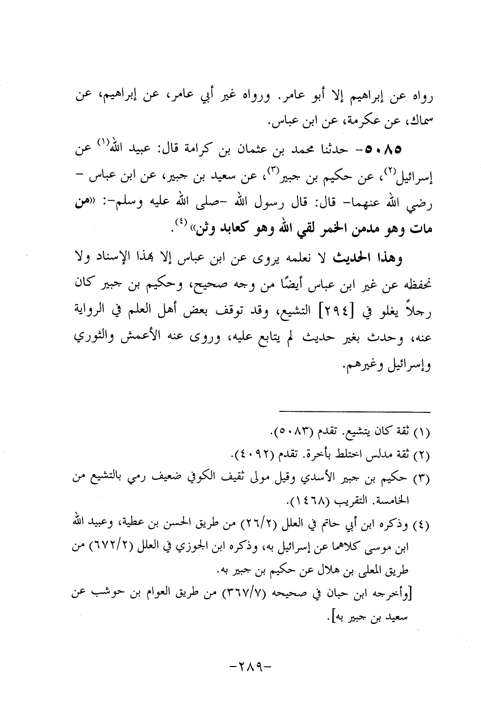 5085- حَدَّثنا مُحَمد بْنُ عُثمَان بْنِ كَرَامَةَ قَالَ: عُبَيد اللَّهِ، عَن إِسْرَائِيلَ، عَن حَكِيمِ بْنِ جُبَير، عَن سَعِيد بْنِ جُبَير، عَنِ ابْنِ عَبَّاسٍ، رَضِي الله عَنْهُمَا، قَالَ رَسُول اللهِ صَلَّى اللَّهُ عَلَيه وَسَلَّم: مَنْ مَاتَ، وهُو مُدْمِنُ الْخَمْرِ لَقِيَ اللَّهَ، وهُو كَعَابِدِ وَثَنٍ.
