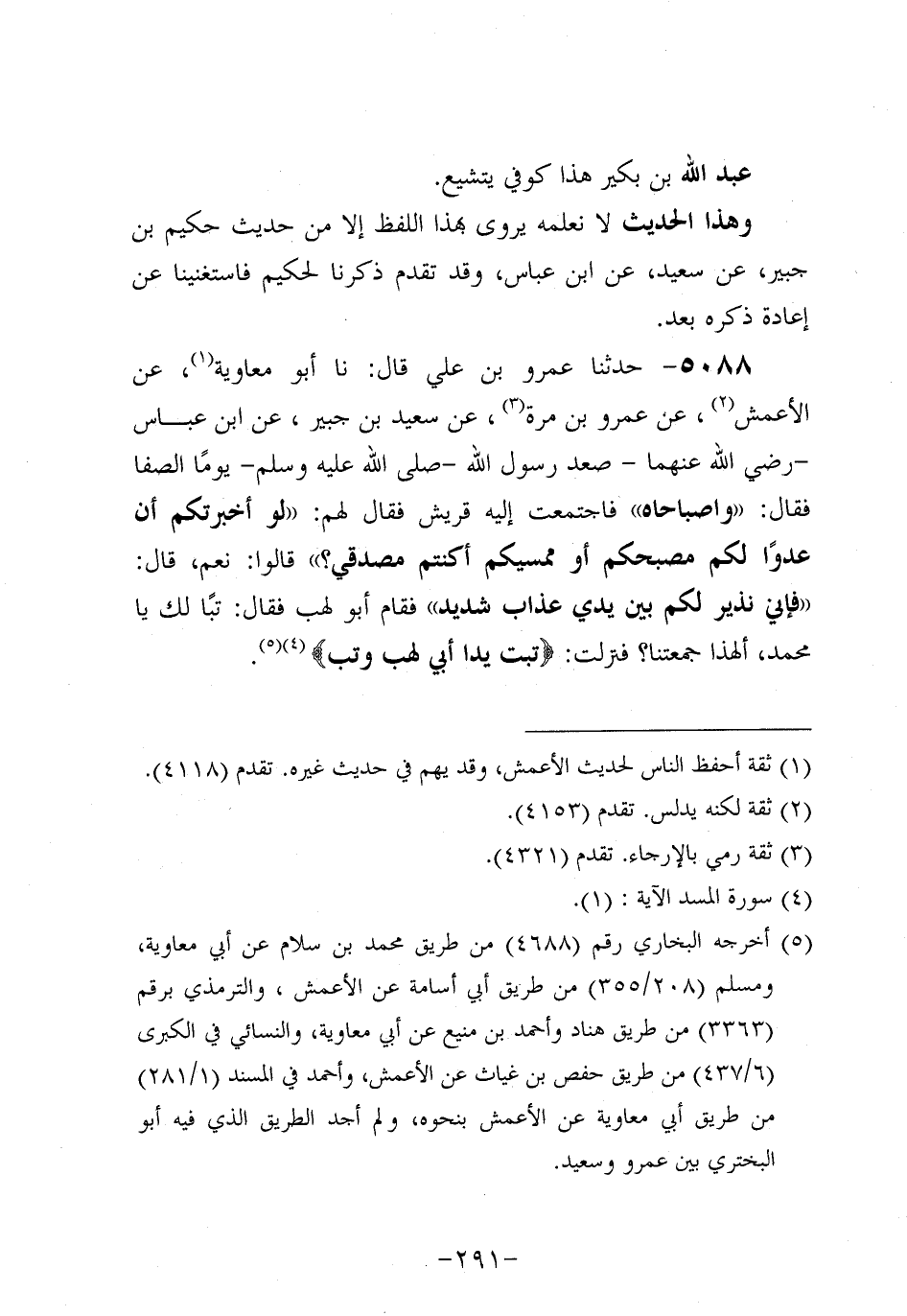 5088- حَدَّثنا عَمْرو بن علي، قَال: حَدَّثنا أَبُو مُعَاوِيَةَ عَنِ الأَعمَش، عَن عَمْرو بْنِ مُرَّةَ، عَن سَعِيد بْنِ جُبَير، عَنِ ابْنِ عَبَّاسٍ، رَضِي اللَّهُ عَنْهُمَا، صَعِدَ رَسُولُ اللَّهِ صَلَّى اللَّهُ عَلَيه وَسَلَّم يَوْمًا الصَّفَا فَقَالَ: وَاصَبَاحَاهُ فَاجْتَمَعَتْ إِلَيْهِ قُرَيْشٌ فَقَالَ لَهُمْ: لَوْ أَخْبَرْتُكُمْ أَنَّ عَدُوًّا لَكُمْ مُصَبِّحُكُمْ، أَوْ مُمَسِّيكُمْ أَكُنْتُمْ مُصَدِّقِيَّ؟ قَالُوا:نَعَمْ قَالَ فَإِنِّي نَذِيرٌ لَكُمْ بَيْنَ يَدَيَّ عَذَابٌ شَدِيدٌ فَقَامَ أَبُو لَهَبٍ فَقَالَ: تَبًّا لَكَ يَا مُحَمد أَلِهَذَا جَمَعْتَنَا؟ فَنَزَلَتْ: {تَبَّتْ يَدَا أَبِي لَهَبٍ وَتَبَّ} .