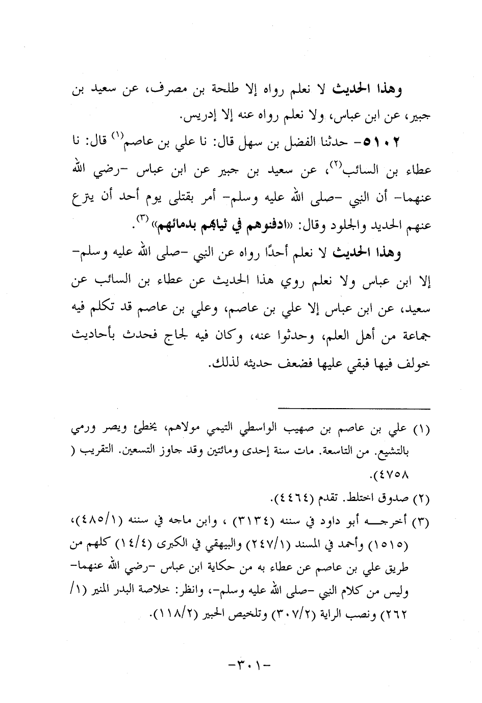5102- حَدَّثنا الفضل بن سَهْل، قَال: حَدَّثنا علي بن عَاصِم، قَال: حَدَّثنا عَطَاءِ بْنِ السَّائِبِ، عَن سَعِيد بْنِ جُبَير، عَنِ ابْنِ عَبَّاسٍ، رَضِي اللَّهُ عَنْهُمَا، أَنَّ النَّبيَّ صَلَّى اللَّهُ عَلَيه وَسَلَّم أَمَرَ بِقَتْلَى يَوِْمَ أُحُدٍ أَنْ يُنْزَع عَنْهُمُ الحديدُ والجلودُ، وَقال: ادْفِنُوهُمْ فِي ثِيَابِهِمْ بِدِمَائِهِمْ.