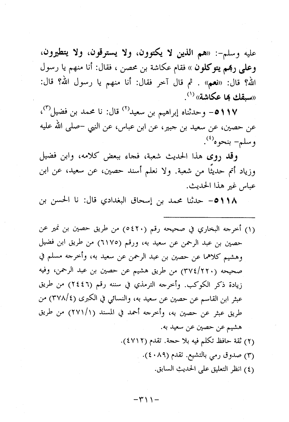 5118- حَدَّثنا مُحَمد بن إسحاق البغدادي، قَال: حَدَّثنا الْحَسَنُ بْنُ الرَّبِيعِ، قَالَ: حَدَّثَنَا أَبُو الأَحْوَصِ، عَنْ عَمَّارِ بْنِ رُزَيْقٍ، عَنْ عَبْدِ اللهِ بْنِ عِيسَى، عَنْ سَعِيدِ بْنِ جُبَيْرٍ، عَنِ ابْنِ عَبَّاسٍ، رَضِي اللَّهُ عَنْهُمَا، قَالَ: كَانَ جِبْرِيلُ جَالِسًا عِنْدَ النَّبِيّ صَلَّى اللَّهُ عَلَيه وَسَلَّم فَسَمِعَ وَقْعًا، فَرَفَعَ رَأْسَهُ، فقال: هذا باب من السماء مَا فُتِحَ قَطُّ إِلا الْيَوْمَ فَنَزَلَ فِيهِ مَلَكٌ فَسَلَّمَ عَلَيْهِ فَقَالَ جِبْرِيلُ: هَذَا مَلَكٌ مَا نَزَلَ قَطُّ إِلَى الأَرْضِ إلاَّ الْيَوْمَ. فَقَالَ لِلنَّبِيِّ صَلَّى اللَّهُ عَلَيه وَسَلَّم: أَبْشِرْ بِمَا لَمْ يُؤْتَهُ مَنْ كَانَ قَبْلَكَ خَوَاتِيمِ سُورَةِ الْبَقَرَةِ أَحْسَبُهُ قَالَ: لَنْ يَقْرَأَ بِهَا أَحَدٌ فَيَسْأَلُ شَيْئًا إلاَّ أُعْطِيَهُ.