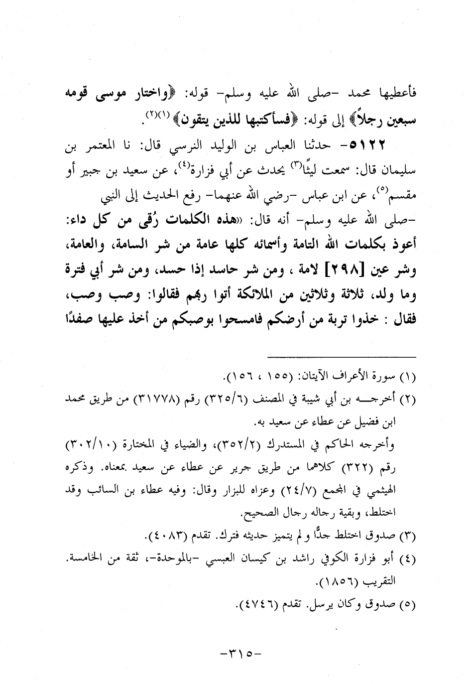 5122- حَدَّثنا العباس بن الوليد النرسي، قَال: حَدَّثنا الْمُعْتَمِرُ بْنُ سُلَيْمَانَ، قَالَ: سَمِعْتُ لَيْثًا، يُحَدِّثُ عَنْ أَبِي فَزَارَةَ، عَنْ سَعِيدِ بْنِ جُبَيْرٍ، أَوْ مِقْسَمٍ، عَنِ ابْنِ عَبَّاسٍ، رَضِي اللَّهُ عَنْهُمَا، رَفَعَ الْحَدِيثَ إِلَى النَّبِيِّ صَلَّى اللَّهُ عَلَيْهِ وسَلَّمَ، أَنَّهُ قَالَ: هَذِهِ الْكَلِمَاتُ وِقَاءٌٌ مِنْ كُلِّ دَاءٍ: أَعُوذُ بِكَلِمَاتِ اللهِ التَّامَّةِ، وَأَسْمَائِهِ كُلِّهَا عَامَّةٍ، مِنْ شَرِّ السَّامَّةِ وَالْعَامَّةِ، وَشَرِّ عَيْنٍ لاَمَّةٍ، وَمِنْ شَرِّ حَاسِدٍ إِذَا حَسَدَ، وَمِنْ شَرِّ أَبِي قَتَرَةَ وَمَا وَلَدَ، ثَلاَثٌة وَثَلاَثين مِنَ الْمَلاَئِكَةِ أَتَوْا رَبَّهُمْ، فَقَالُوا: وَصَبَ وَصَبٌ؟ فَقَالَ: خُذُوا تُرْبَةً مِنْ أَرْضِكُمْ، فَامْسَحُوا بِوَصَبِكُمْ، مَنْ أَخَذَ عَلَيْهَا صَفَدًا، أَوْ كَتَمَهَا أَحَدًا، فَلاَ أَفْلَحَ إِذًا أَبَدًا.