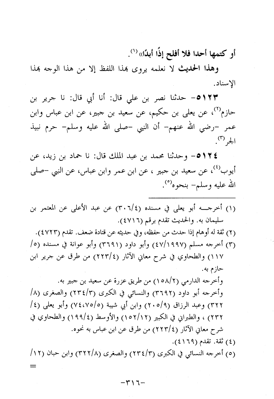 5123- حَدَّثنا نصر بن علي، قال: أَخْبَرَنَا أبي، قَال: حَدَّثنا جَرِيرُ بْنُ حَازِمٍ عَنْ يَعْلَى بْنِ حَكِيمٍ، عَن سَعِيد بْنِ جُبَير، عَنِ ابْنِ عَبَّاسٍ، وَابن عُمَر رَضِيَ اللَّهُ عَنْهُمْ أَنَّ النَّبيَّ صَلَّى اللَّهُ عَلَيه وَسَلَّم حَرَّمَ نَبِيذَ الْجَرِّ.