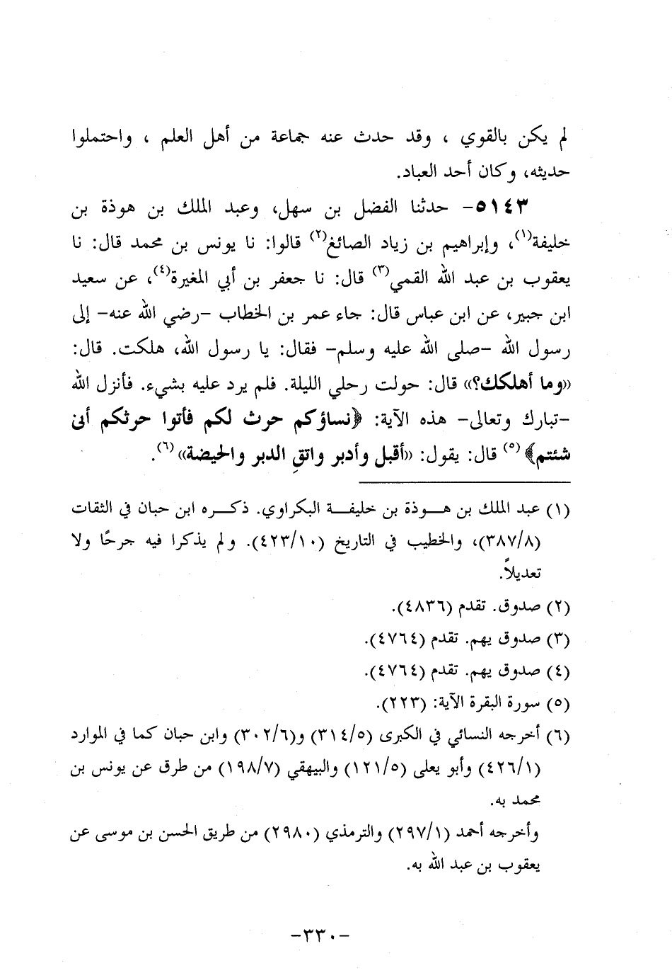 5143- حَدَّثنا الْفَضْلُ بْنُ سَهْل وَعَبْدُ الْمَلِكِ بْنُ هَوْذَةَ بْنِ خَلِيفَةَ وَإِبْرَاهِيمُ بْنُ زِيَادٍ الصَّائِغُ، قالوا: حَدَّثنا يونس بن مُحَمد، قَال: حَدَّثنا يعقوب بن عَبد الله القمي، قَال: حَدَّثنا جَعْفَرِ بْنِ أَبِي الْمُغِيرَةِ، عَن سَعِيد بْنِ جُبَير، عَنِ ابْنِ عَبَّاسٍ قَالَ: جَاءَ عُمَر بْنُ الْخَطَّابِ، رَضِي اللَّهُ عَنْهُ، إِلَى رَسُولِ اللَّهِ صَلَّى اللَّهُ عَلَيه وَسَلَّم فَقَالَ: يَا رَسولَ اللهِ هَلَكْتُ قَالَ: وَمَا أَهْلَكَكَ؟ قَالَ: حَوَّلْتُ رَحْلِيَ اللَّيْلَةَ فَلَمْ يَرُدَّ عَلَيْهِ بِشَيْءٍ. فَأَنْزَلَ اللَّهُ تَبَارَكَ وَتَعَالَى هَذِهِ الآيَةَ: {نِسَاؤُكُمْ حرث لكم فأتوا حرثكم أني شئتم} قَالَ: يَقُولُ: أَقْبِلْ وَأَدْبِرْ، وَاتَّقِ الدُّبُرَ، وَالْحَيْضَةَ.