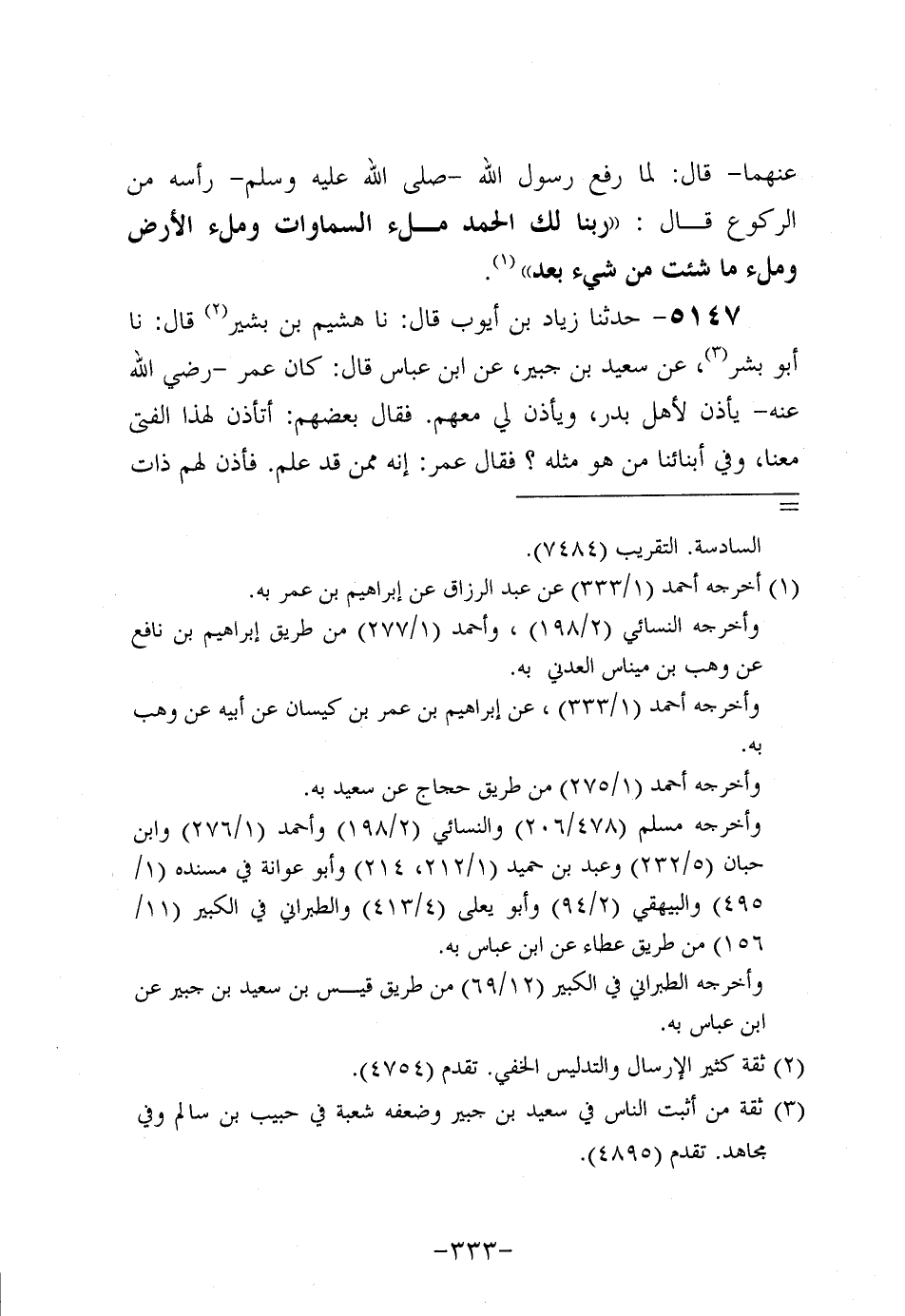 5147- حَدَّثنا زياد بن أيوب، قَال: حَدَّثنا هشيم بن بشير، قَال: حَدَّثنا أَبُو بِشْرٍ، عَن سَعِيد بْنِ جُبَير، عَنِ ابْنِ عَبَّاسٍ قَالَ: كَانَ عُمَر، رَضِي اللَّهُ عَنْهُ، يَأْذَنِ لأَهْلِ بَدْرٍ وَيَأْذَنُ لِي مَعَهُمْ فَقَالَ بَعْضُهُمْ: أَتَأْذَنُ لِهَذَا الْفَتَى مَعَنَا وَفِي أَبْنَائِنَا مَنْ هُوَ مِثْلُهُ؟ فَقَالَ عُمَر: إِنَّهُ مِمَّنْ قَدْ عَلِمَ فَأَذِنَ لَهُمْ ذَاتَ يَوْمٍ وَأَذِنَ لِي مَعَهُمْ فَسَأَلَهُمْ عَنْ هَذِهِ السُّورَةِ: {إذا جاء نصر الله والفتح} فَقَالُوا: أَمَرَ اللَّهُ تَبَارَكَ وَتَعَالَى نَبِيَّهُ إِذَا فَتَحَ اللَّهُ لَهُ أَنْ يَسْتَغْفِرَهُ وَيَتُوبَ إِلَيْهِ فَقَالَ: مَا تَقُولُ يَا ابْنَ عَبَّاسٍ؟ فَقُلْتُ: لَيْسَ كَذَلِكَ، وَلكن أَخْبَرَ نَبِيَّهُ بِحُضُورِ أَجَلِهِ فقال: {إذا جاء نصر الله والفتح} فَتْحُ مَكَّةَ {وَرَأَيْتَ النَّاسَ يَدْخُلُونَ فِي دِينِ الله أفواجا} فَذَلِكَ عَلامَةُ مَوْتِكَ {فَسَبِّحْ بِحَمْدِ رَبِّكَ وَاسْتَغْفِرْهُ إنه كان توابا} فَقَالَ لَهُمْ عُمَر: كَيْفَ تَلُومُونَنِي عَلَيْهِ بَعْدَ مَا ترون؟.