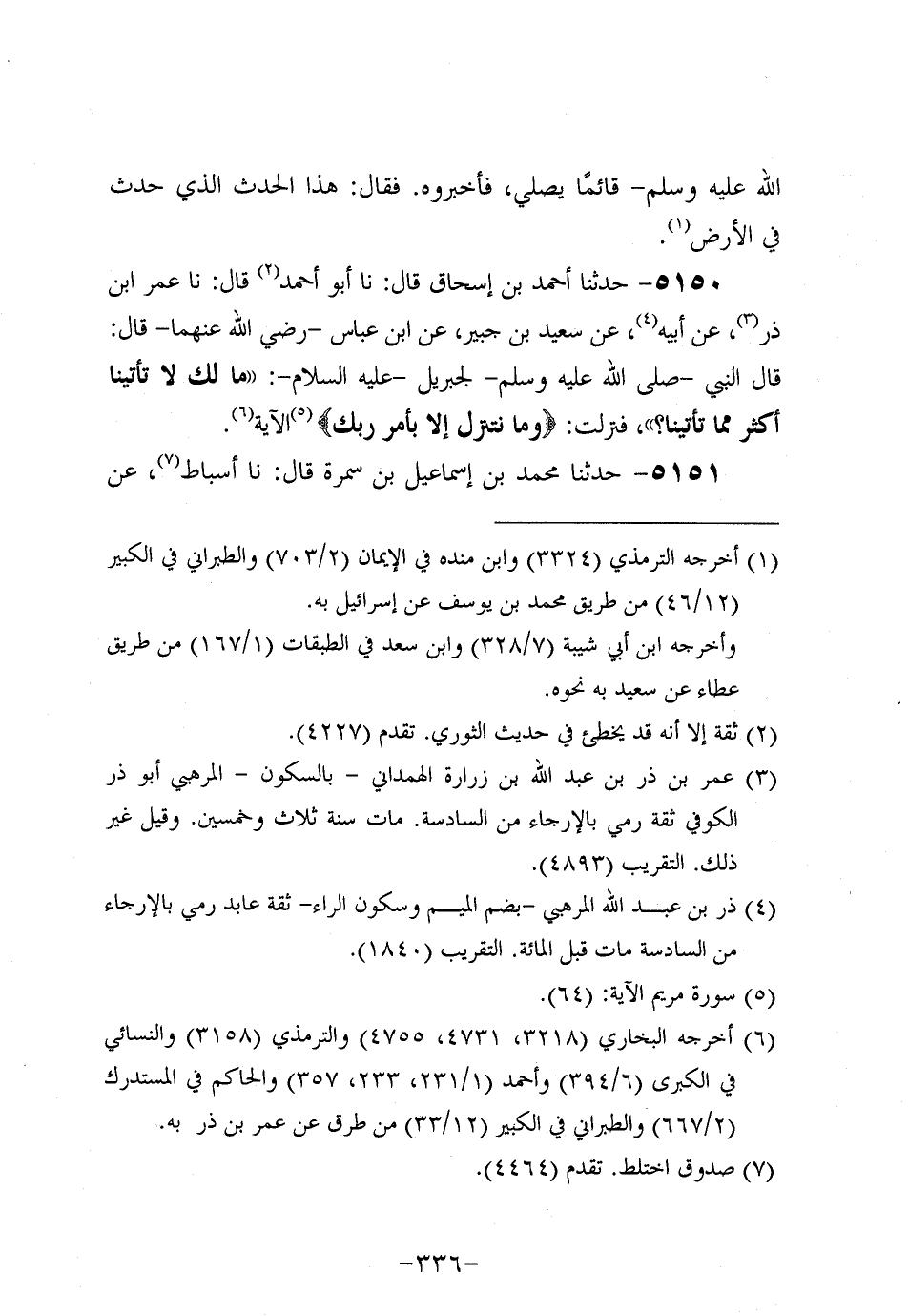 5150- حَدَّثنا أحمد بن إسحاق، قَال: حَدَّثنا أَبُو أحمد، قَال: حَدَّثنا عُمَر بْنُ ذَرٍّ، عَن أَبيهِ، عَن سَعِيد بْنِ جُبَير، عَنِ ابْنِ عَبَّاسٍ، رَضِي اللَّهُ عَنْهُمَا، قَالَ: قَالَ النَّبِيّ صَلَّى اللَّهُ عَلَيه وَسَلَّم لِجِبْرِيلَ عَلَيْهِ السَّلامُ: مَا لَكَ لا تَأْتِينَا أَكْثَرَ مِمَّا تَأْتِينَا؟ فَنَزَلَتْ: {وَمَا نَتَنَزَّلُ إلاَّ بأمر ربك} الآية.