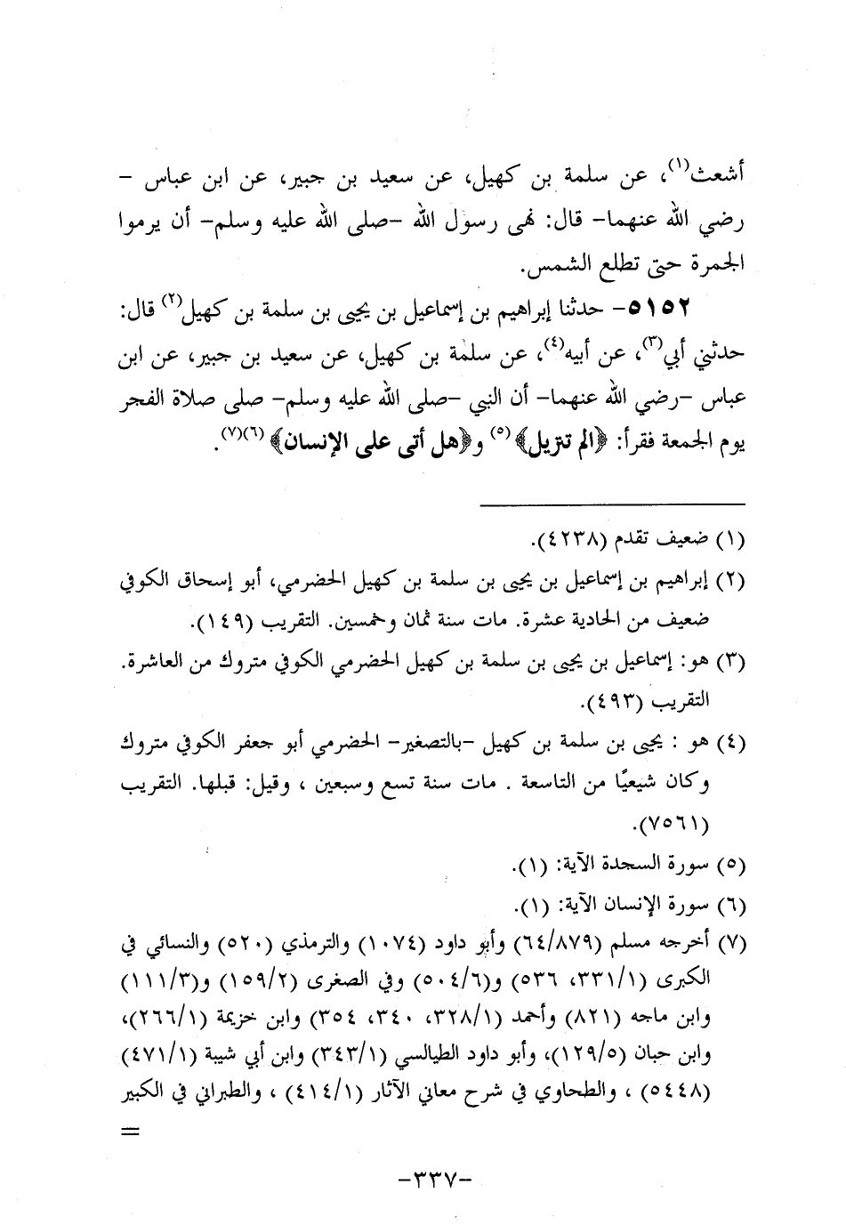 5152- حَدَّثنا إِبْرَاهِيمُ بْنُ إِسْمَاعِيلَ بْنِ يَحْيَى بْنِ سَلَمة بْنِ كُهَيل قَالَ: حَدَّثَنِي أَبِي، عَن أَبيهِ، عَن سَلَمة بْنِ كُهَيل، عَن سَعِيد بْنِ جُبَير، عَنِ ابْنِ عَبَّاسٍ، رَضِي اللَّهُ عَنْهُمَا، أَنَّ النَّبيَّ صَلَّى اللَّهُ عَلَيه وَسَلَّم صَلَّى صَلاةَ الْفَجْرِ يَوْمَ الْجُمُعَةِ فَقَرَأَ: {الَم تَنْزِيلٌ} ، و {هَلْ أَتَى عَلَى الإِنْسَانِ} .