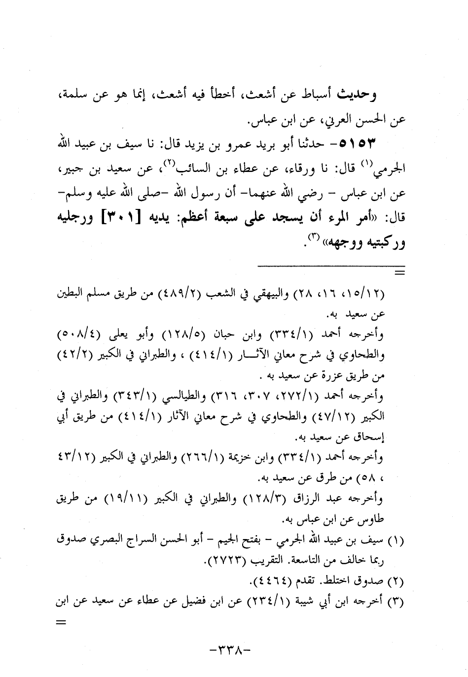 5153- حَدَّثنا أَبُو بُرَيْدٍ عَمْرو بْنُ يَزِيدَ، قَال: حَدَّثنا سيف بن عُبَيد الله الجرمي، قَال: حَدَّثنا وَرْقَاءُ، عَن عَطاء بْنِ السَّائِبِ، عَن سَعِيد بْنِ جُبَير، عَنِ ابْنِ عَبَّاسٍ، رَضِي اللَّهُ عَنْهُمَا، أَنَّ رَسُولَ اللهِ صلى الله لعيه وَسَلَّمَ قَالَ: أُمِرَ الْمَرْءُ أَنْ يَسْجُدَ عَلَى سَبْعَةِ أَعْظُمٍ: يَدَيْهِ وَرِجْلَيْهِ وَرُكْبَتَيْهِ وَوَجْهِهِ.