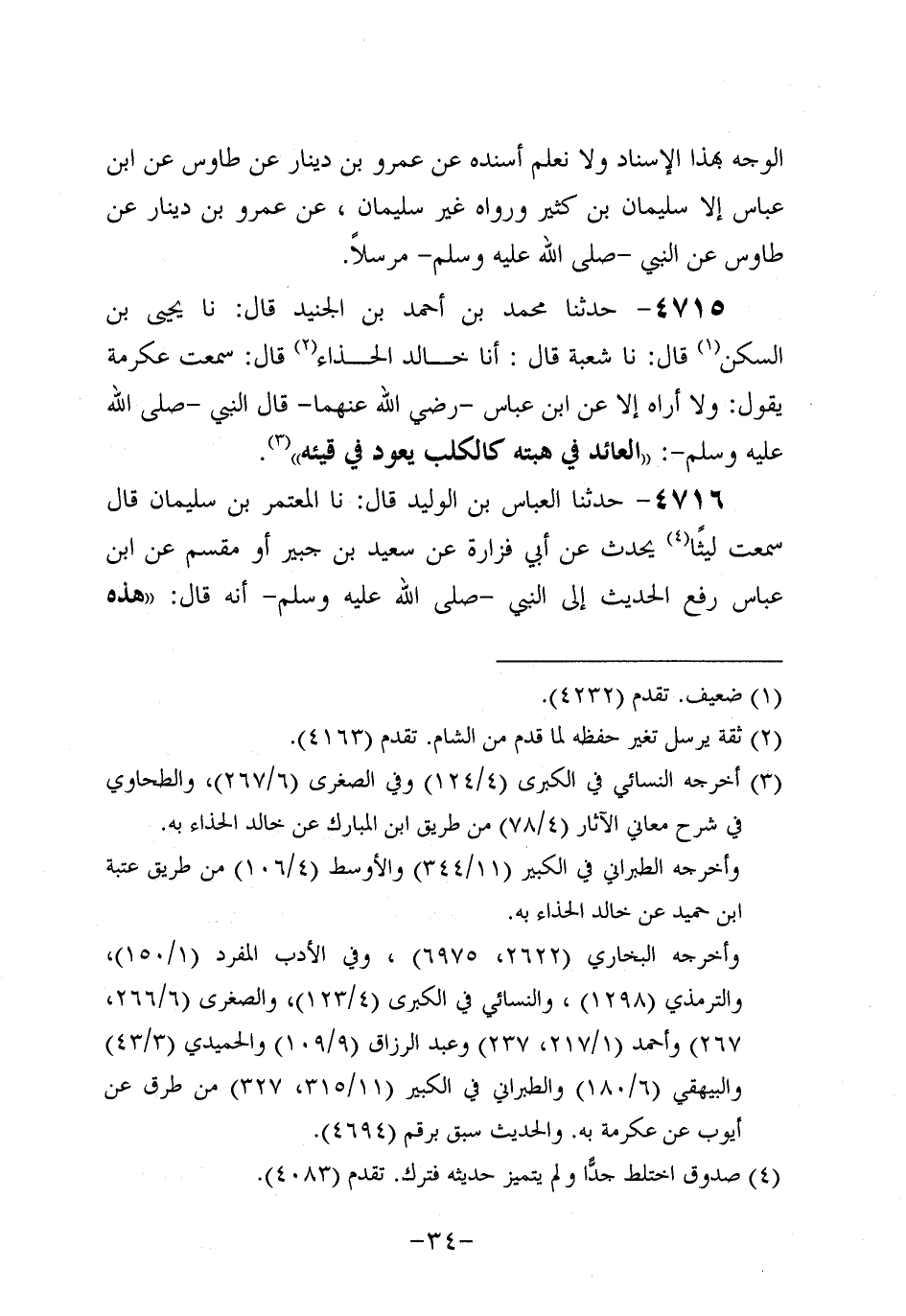 4715- حَدَّثنا مُحَمد بْنُ أَحْمَدَ بْنِ الْجُنَيْدِ، قَال: حَدَّثنا يَحْيَى بن السكن، قَال: حَدَّثنا شعبة، قال: أَخْبَرَنَا خَالِدٌ الحَذَّاء، قَالَ: سَمِعْتُ عِكْرِمَةَ يَقُولُ: ولاَ أَرَاهُ إلاَّ عَنِ ابْنِ عَبَّاسٍ، رَضِي اللَّهُ عَنْهُمَا، قَالَ النَّبِيّ صَلَّى اللَّهُ عَلَيه وَسَلَّم: الْعَائِدُ فِي هِبَتِهِ كَالْكَلْبِ يَعُودُ فِي قَيْئِهِ.