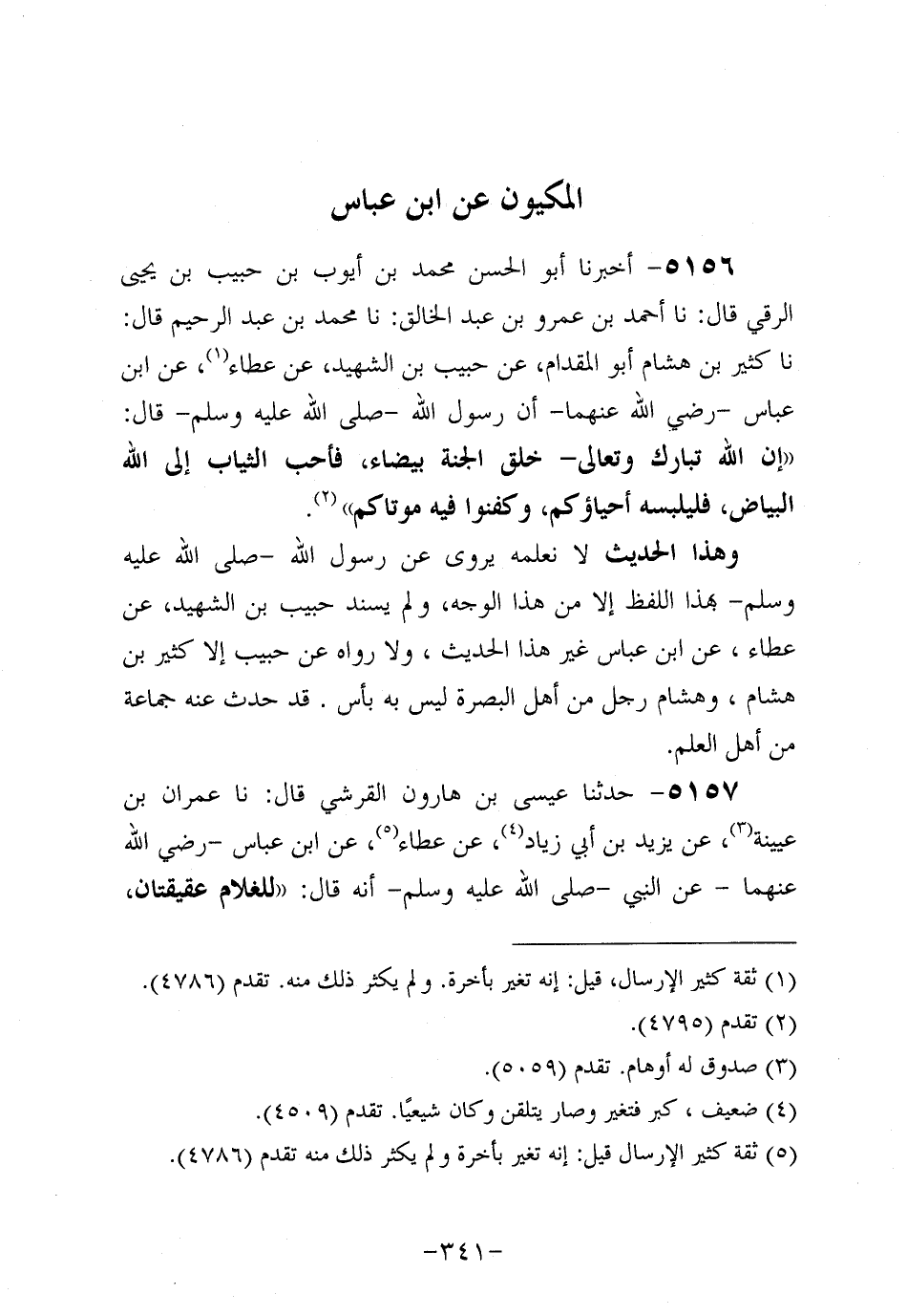 5157- حَدَّثنا عيسى بن هارون القرشي، قَال: حَدَّثنا عِمْرَانُ بْنُ عُيَيْنة، عَنْ يَزِيدَ بْنِ أَبِي زِيَادٍ، عَن عَطاء، عَنِ ابْنِ عَبَّاسٍ، رَضِي اللَّهُ عَنْهُمَا، عَنِ النَّبِيّ صَلَّى اللَّهُ عَلَيه وَسَلَّم؛ أَنَّه قال: للغلام عقيقتان للجارية عَقِيقَةٌ.