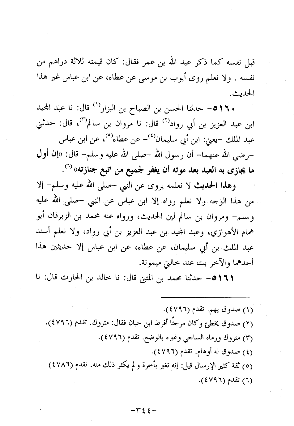 5160- حَدَّثنا الْحَسَنُ بْنُ الصَّبَّاحِ بْنِ الْبَزَّارِ، قَال: حَدَّثنا عَبد الْمَجِيدِ بْنُ عَبد الْعَزِيزِ بْنِ أَبِي رواد، قَال: حَدَّثنا مَرْوَانَ بْنِ سَالِمٍ قَالَ: حَدَّثَنِي عَبد الْمَلِكِ، يَعْنِي ابْنَ أَبِي سُلَيْمَانَ، عَن عَطاء، عَنِ ابْنِ عَبَّاسٍ، رَضِي اللَّهُ عَنْهُمَا، أَنَّ رَسُولَ اللهِ صَلَّى اللَّهُ عَلَيه وَسَلَّم قَالَ: إِنَّ أَوَّلَ مَا يُجَازَى بِهِ الْعَبْدُ بَعْدَ مَوْتِهِ أَنْ يُغْفَرَ لِجَمِيعِ مَنِ اتَّبَعَ جَنَازَتَهُ.
