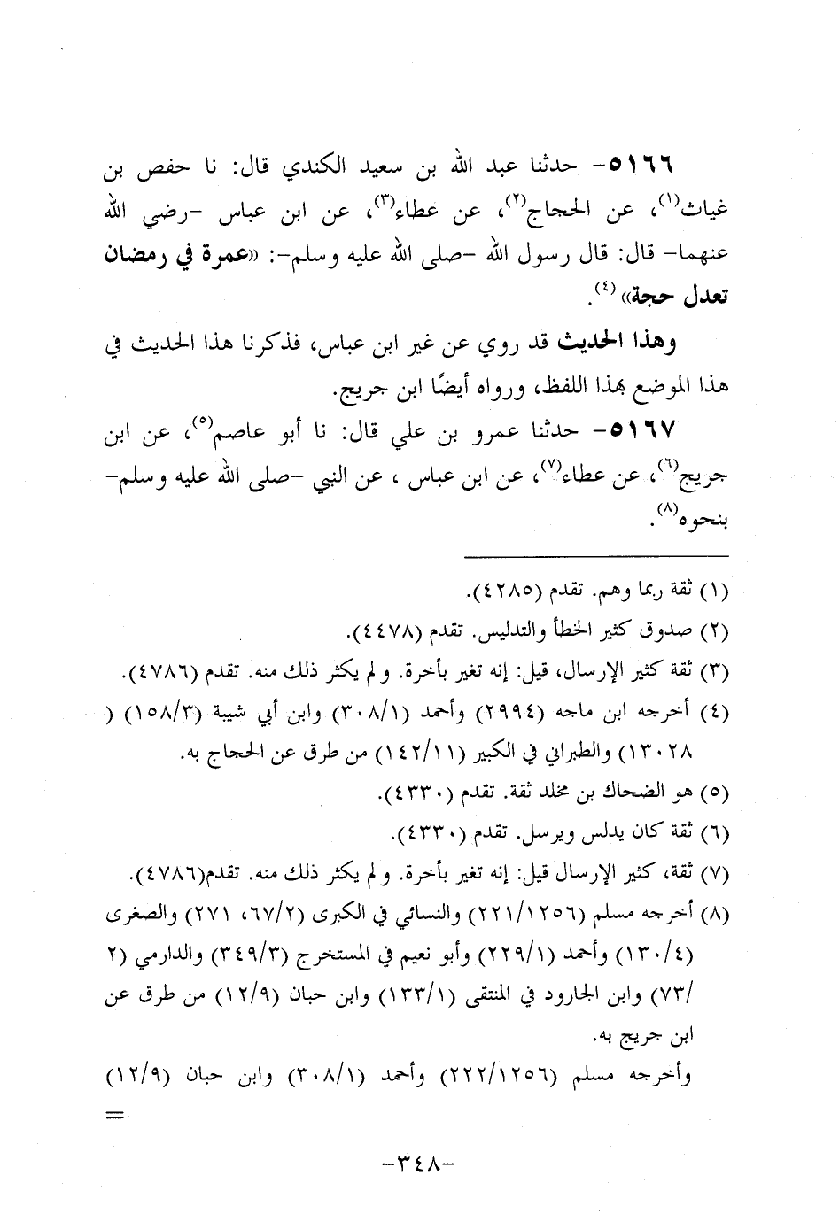 5166- حَدَّثنا عَبد اللَّهِ بْنُ سَعِيد الْكِنْدِيُّ، قَال: حَدَّثنا حَفْصُ بْنُ غِيَاثٍ، عَن الحَجَّاج، عَن عَطاء، عَنِ ابْنِ عَبَّاسٍ، رَضِي اللَّهُ عَنْهُمَا، قَالَ: قَالَ رَسُول اللهِ صَلَّى اللَّهُ عَلَيه وَسَلَّم: عُمْرة فِي رَمَضَانَ تَعْدِلُ حَجَّةً.