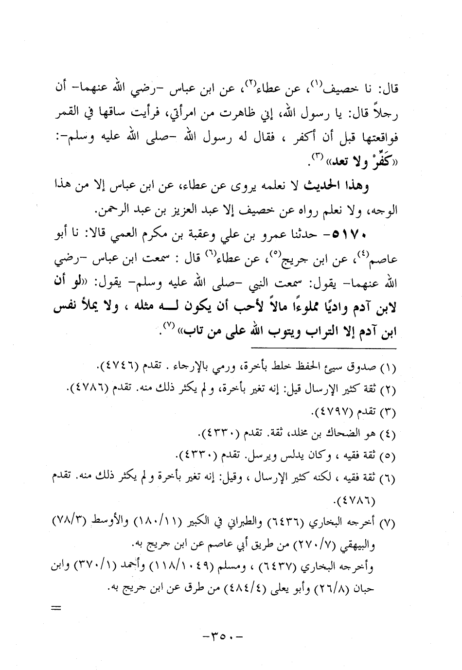 5170- حَدَّثنا عَمْرو بْنُ عَلِيٍّ، وعُقبة بْنُ مُكْرَمٍ العمي، قَالاَ: حَدَّثنَا أَبُو عَاصِم، عَن ابْنِ جُرَيج، عَن عَطَاءٍ، قَالَ: سَمِعْتُ ابْنَ عَبَّاسٍ، رَضِي اللَّهُ عَنْهُمَا، يَقُولُ: سَمِعْتُ النَّبِيّ صَلَّى اللَّهُ عَلَيه وَسَلَّم يَقُولُ: لَوْ أَنَّ لابْنِ آدَمَ وَادِيًا مَمْلُوءًا مَالا لأَحَبَّ أَنْ يَكُونَ لَهُ مِثْلُهُ، ولاَ يملأ نفس بن آدَمَ إلاَّ التُّرَابُ وَيَتُوبُ اللَّهُ عَلَى مَنْ تَابَ.
