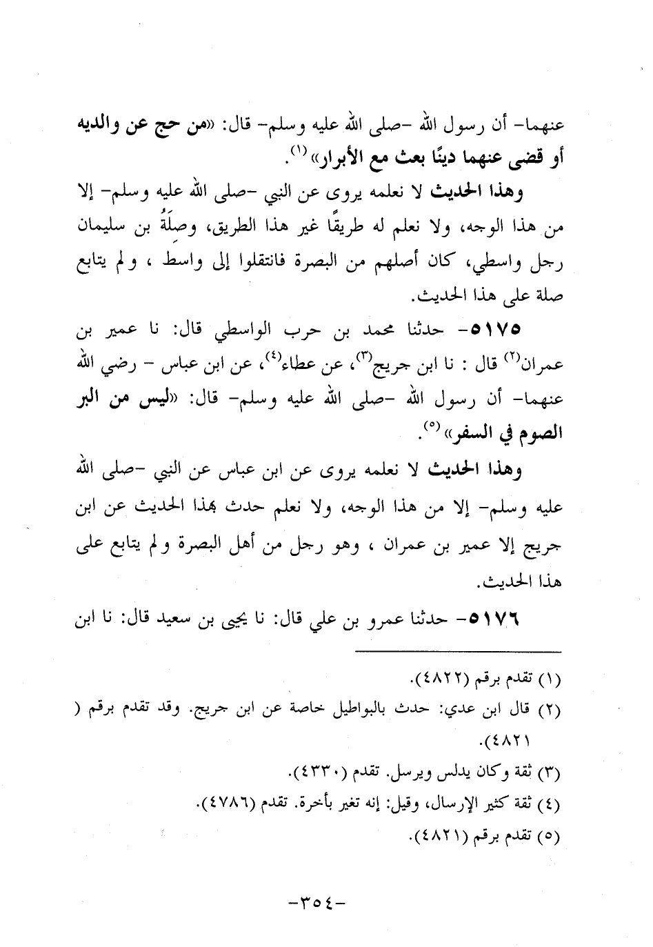 5175- حَدَّثنا مُحَمد بن حرب الواسطي، قَال: حَدَّثنا عمير بن عمران، قَال: حَدَّثنا ابْنُ جُرَيج، عَن عَطَاءٍ، عَنِ ابْنِ عَبَّاسٍ، رَضِي اللَّهُ عَنْهُمَا، أَنَّ رَسُولَ اللهِ صَلَّى اللَّهُ عَلَيه وَسَلَّم قَالَ: لَيْسَ مِنَ الْبِرِّ الصَّوْمُ فِي السَّفَرِ.
