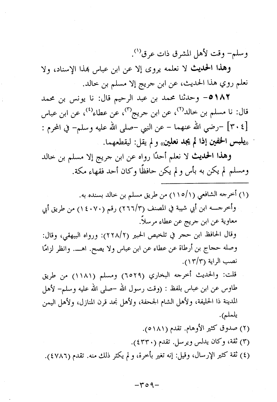 5182- وحَدَّثنا مُحَمد بن عَبد الرحيم، قَال: حَدَّثنا يونس بن مُحَمد، قَال: حَدَّثنا مُسْلِمُ بْنُ خَالِدٍ، عَن ابْنِ جُرَيج، عَن عَطَاءٍ، عَنِ ابْنِ عَبَّاسٍ، رَضِي اللَّهُ عَنْهُمَا، عَنِ النَّبِيّ صَلَّى اللَّهُ عَلَيه وَسَلَّم فِي الْمُحَرَّمِ يَلْبَسُ الْخُفَّيْنِ إِذَا لَمْ يَجِدْ نَعْلَيْنِ وَلَمْ يَقُلْ: لِيَقْطَعْهُمَا.
