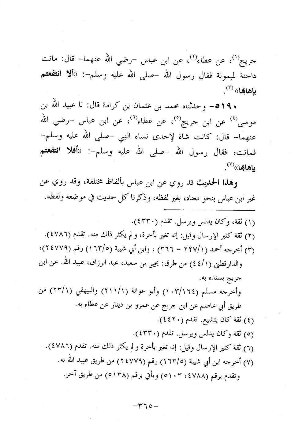 5190- وحَدَّثناه مُحَمد بْنُ عُثمَان بْنِ كَرَامَةَ، قَال: حَدَّثنا عُبَيد اللَّهِ بْنُ مُوسَى، عَن ابْنِ جُرَيج، عَن عَطَاءٍ، عَنِ ابْنِ عَبَّاسٍ، رَضِي اللَّهُ عَنْهُمَا، قَالَ: كَانَتْ شَاةٌ لإِحْدَى نِسَاءِ النَّبِيّ صَلَّى اللَّهُ عَلَيه وَسَلَّم فَمَاتَتْ فَقَالَ رَسُولُ اللَّهِ صَلَّى اللَّهُ عَلَيه وَسَلَّم: أَفَلا انْتَفَعْتُمْ بِإِهَابِهَا.