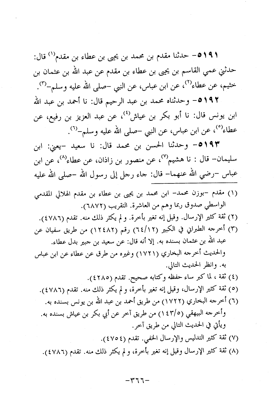 5191- حَدَّثنا مُقَدِّمُ بْنُ مُحَمد بْنِ يَحْيَى بْنِ عَطَاءِ بْنِ مُقَدِّمٍ قَالَ: حَدَّثَنِي عَمِّي الْقَاسِمُ بْنُ يَحْيَى بْنِ عَطَاءِ بْنِ مُقَدِّمٍ عَنْ عَبد اللَّهِ بْنُ عُثمَان بْنِ خُثَيم، عَن عَطَاءٍ، عَن ابنِ عَباس، عَن النَّبِيّ صَلَّى الله عَلَيه وَسَلَّم (ح)