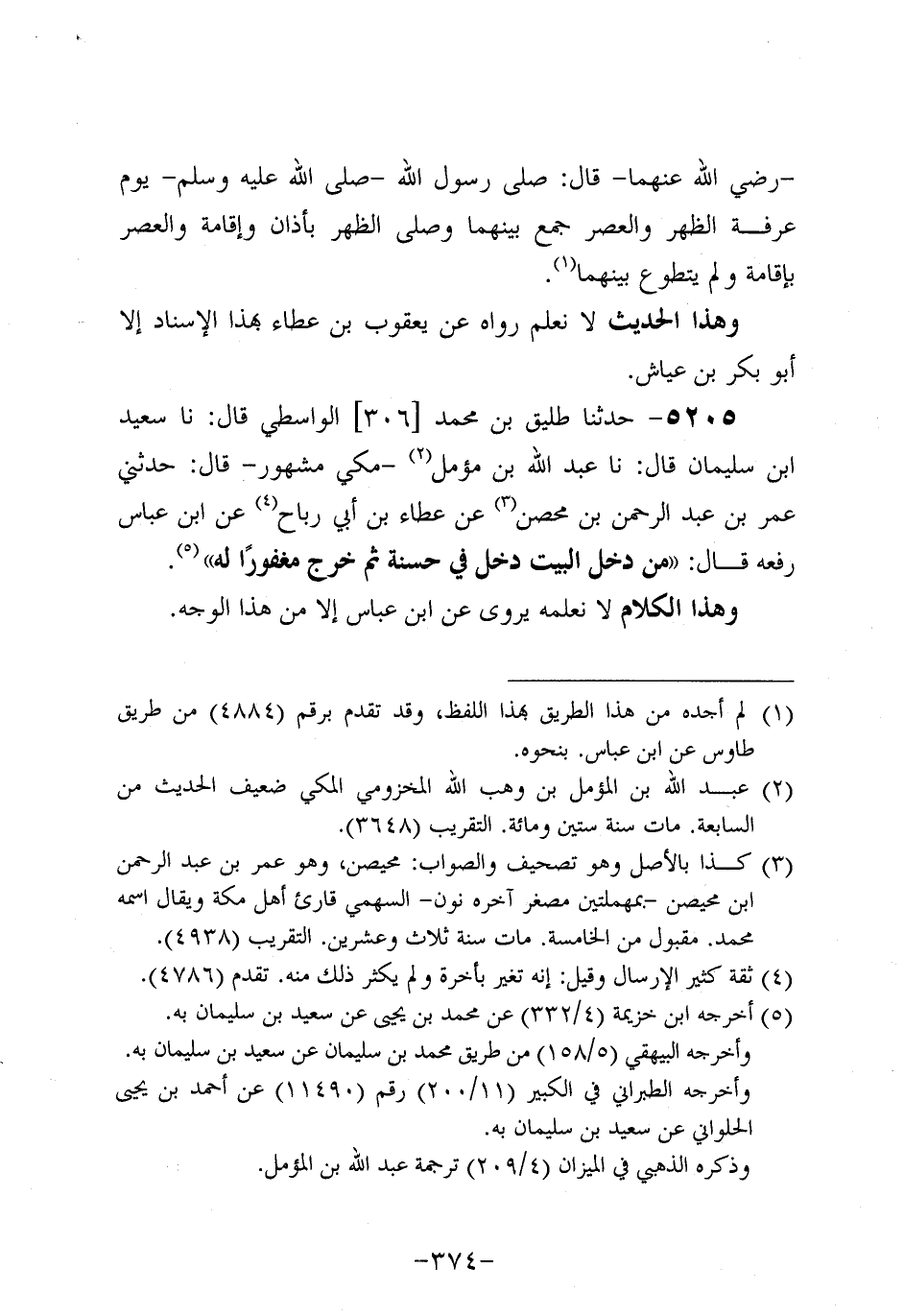 5205- حَدَّثنا طليق بن مُحَمد الواسطي، قَال: حَدَّثنا سَعِيد بن سليمان، قَال: حَدَّثنا عَبد اللَّهِ بْنُ مُؤَمَّل، مَكِّيٌّ مَشْهُورٌ، قَالَ: حَدَّثَنِي عُمَر بْنُ عَبد الرَّحْمَنِ بْنِ مُحصن، عَن عَطاء بْنِ أَبِي رَبَاحٍ، عَنِ ابْنِ عَبَّاسٍ رَفَعَهُ قَالَ: مَنْ دَخَلَ الْبَيْتَ دَخَلَ فِي حَسَنَةٍ، ثُمَّ خَرَجَ مَغْفُورًا لَهُ.