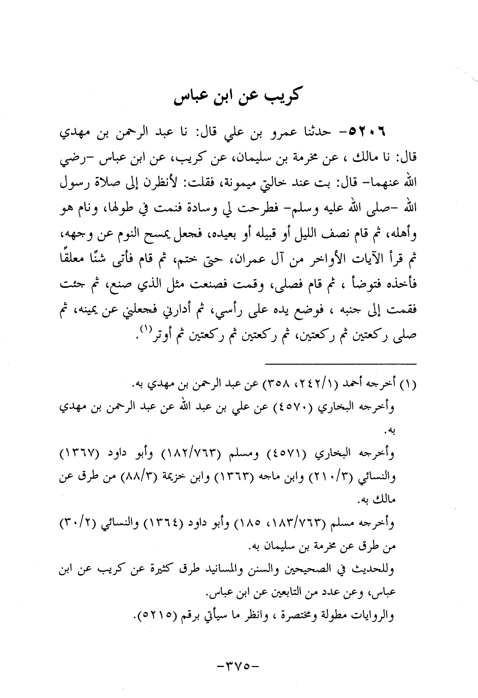 5206- حَدَّثنا عَمْرو بْنُ علي، قَال: حَدَّثنا عَبد الرحمن بن مهدي، قَال: حَدَّثنا مَالِكٌ عَنْ مَخْرَمَةَ بْنِ سُلَيْمَانَ عَنْ كُرَيب، عَنِ ابْنِ عَبَّاسٍ، رَضِي اللَّهُ عَنْهُمَا، قَالَ: بِتُّ عِنْدَ خَالَتِي مَيْمُونَةَ فَقُلْتُ: لأَنْظُرَنَّ إِلَى صَلاةُ رَسُولِ اللَّهِ صَلَّى اللَّهُ عَلَيه وَسَلَّم فَطُرِحَتْ لِي وِسَادَةٌ فَنِمْتُ فِي طُولِهَا وَنَامَ هُوَ وَأَهْلُهُ، ثُمَّ قَامَ نِصْفَ اللَّيْلِ، أَوْ قُبَيْلَهُ، أَوْ بُعَيْدَهُ فَجَعَلَ يَمْسَحُ النَّوْمَ عَنْ وَجْهِهِ، ثُمَّ قَرَأَ الآيَاتِ الأَوَاخِرَ مِنْ آلِ عِمْرَانَ حَتَّى خَتَمَ، ثُمَّ قَامَ فَأَتَى شَنًّا مُعَلَّقًا فَأَخَذَهُ فَتَوَضَّأَ، ثُمَّ قَامَ فَصَلَّى وَقُمْتُ فَصَنَعْتُ مِثْلَ الَّذِي صَنَعَ، ثُمَّ جِئْتُ فَقُمْتُ إِلَى جَنْبِهِ فَوَضَعَ يَدَهُ عَلَى رَأْسِي، ثُمَّ أَدَارَنِي فَجَعَلَنِي عَنْ يَمِينِهِ، ثُمَّ صَلَّى رَكْعَتَيْنِ، ثُمَّ رَكْعَتَيْنِ، ثُمَّ رَكْعَتَيْنِ، ثُمَّ رَكْعَتَيْنِ، ثُمَّ أَوْتَرَ.