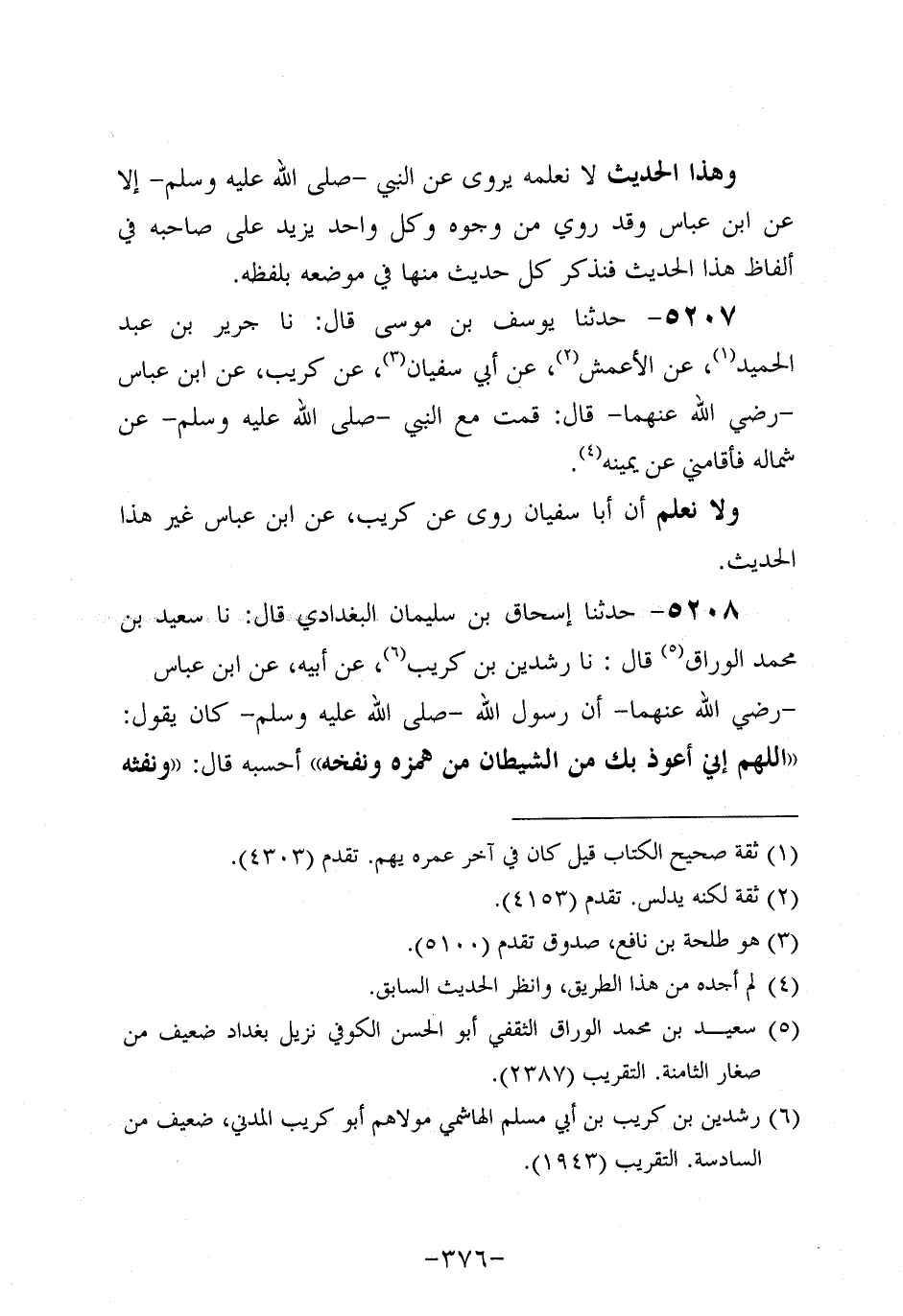 5208- حَدَّثنا إسحاق بن سليمان البغدادي، قَال: حَدَّثنا سَعِيد بن مُحَمد الوراق، قَال: حَدَّثنا رِشْدِينُ بْنُ كُرَيب، عَن أَبيهِ، عَنِ ابْنِ عَبَّاسٍ، رَضِي اللَّهُ عَنْهُمَا، أَنَّ رَسُولَ اللهِ صَلَّى اللَّهُ عَلَيه وَسَلَّم كَانَ يَقُولُ: اللَّهُمَّ إِنِّي أَعُوذُ بِكَ مِنَ الشَّيْطَانِ مِنْ هَمْزِهِ وَنَفْخِهِ أَحْسَبُهُ قَالَ: وَنَفْثِهِ وَمِنْ عَذَابِ الْقَبْرِ فَقِيلَ: يَا رَسولَ اللهِ مَا هَذَا الَّذِي تَعَوَّذُ مِنْهُ؟ قَالَ: أَمَّا هَمْزُهُ فَالَّذِي يُوَسْوِسُهُ وَأَمَّا نَفْثُهُ فَالشِّعْرُ وَأَمَّا نَفْخُهُ فَالَّذِي يُلْقَى مِنَ الشُّبَهِ، يَعْنِي: فِي الصَّلاةِ لِيَقْطَعَ عَلَيْهِ صَلاتَهُ، أَوْ عَلَى الإِنْسَانِ صَلاتَهُ وَأَمَّا عَذَابُ الْقَبْرِ فَكَانَ يَقُولُ: أَكْثَرُ عَذَابِ الْقَبْرِ مِنَ الْبَوْلِ.